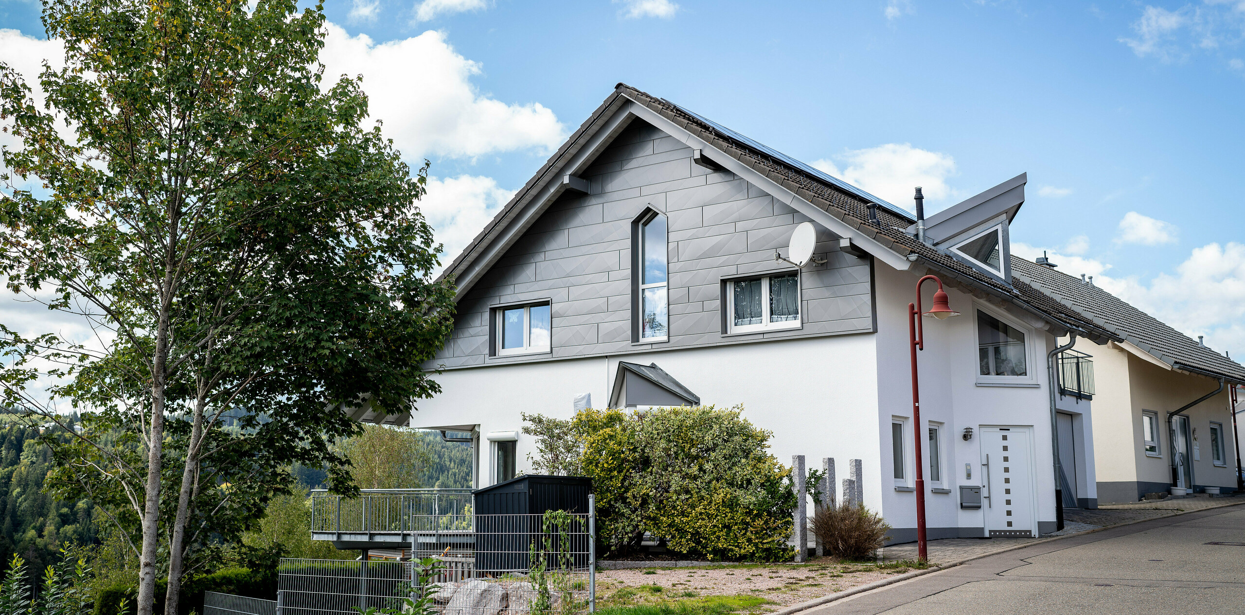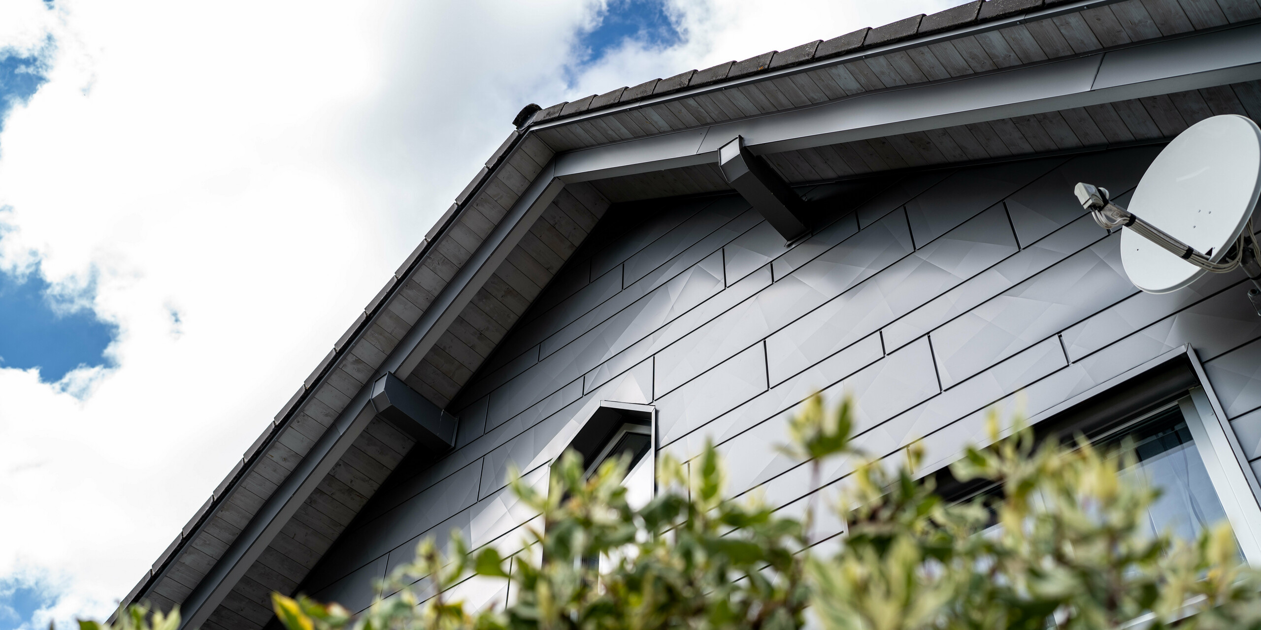 Bei diesem Einfamilienhaus wurden die Giebel, die ursprünglich mit einer Holzverkleidung gemacht wurden, neu mit dem wartungsarmen Aluminium von PREFA – Siding.X in Rauchsilber, verkleidet.