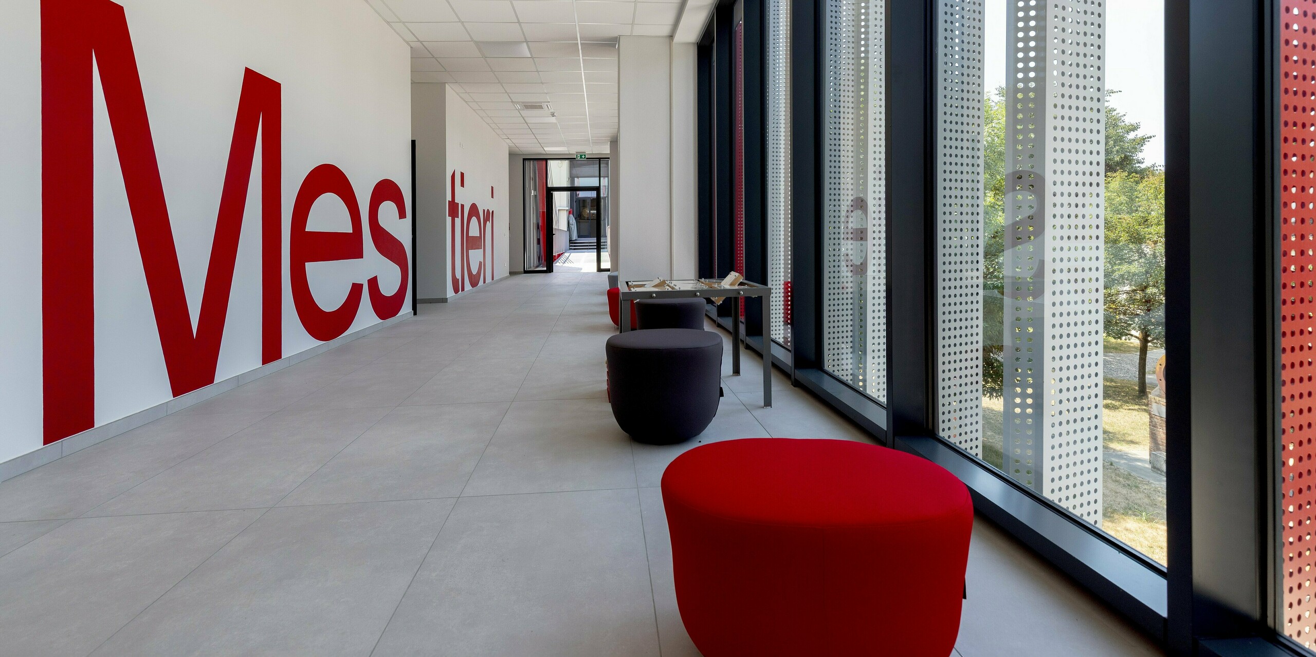 Bereits auf den ersten Blick prägt die vertikale Fassadengliederung in Dunkelgrau und Patinagrau das Erscheinungsbild, das durch dynamische rote Akzente ergänzt wird. Diese farblichen Highlights verleihen dem Gebäude Tiefe und Energie. Die transparenten und perforierten Fassadenelemente schaffen zudem spannende Lichtspiele.