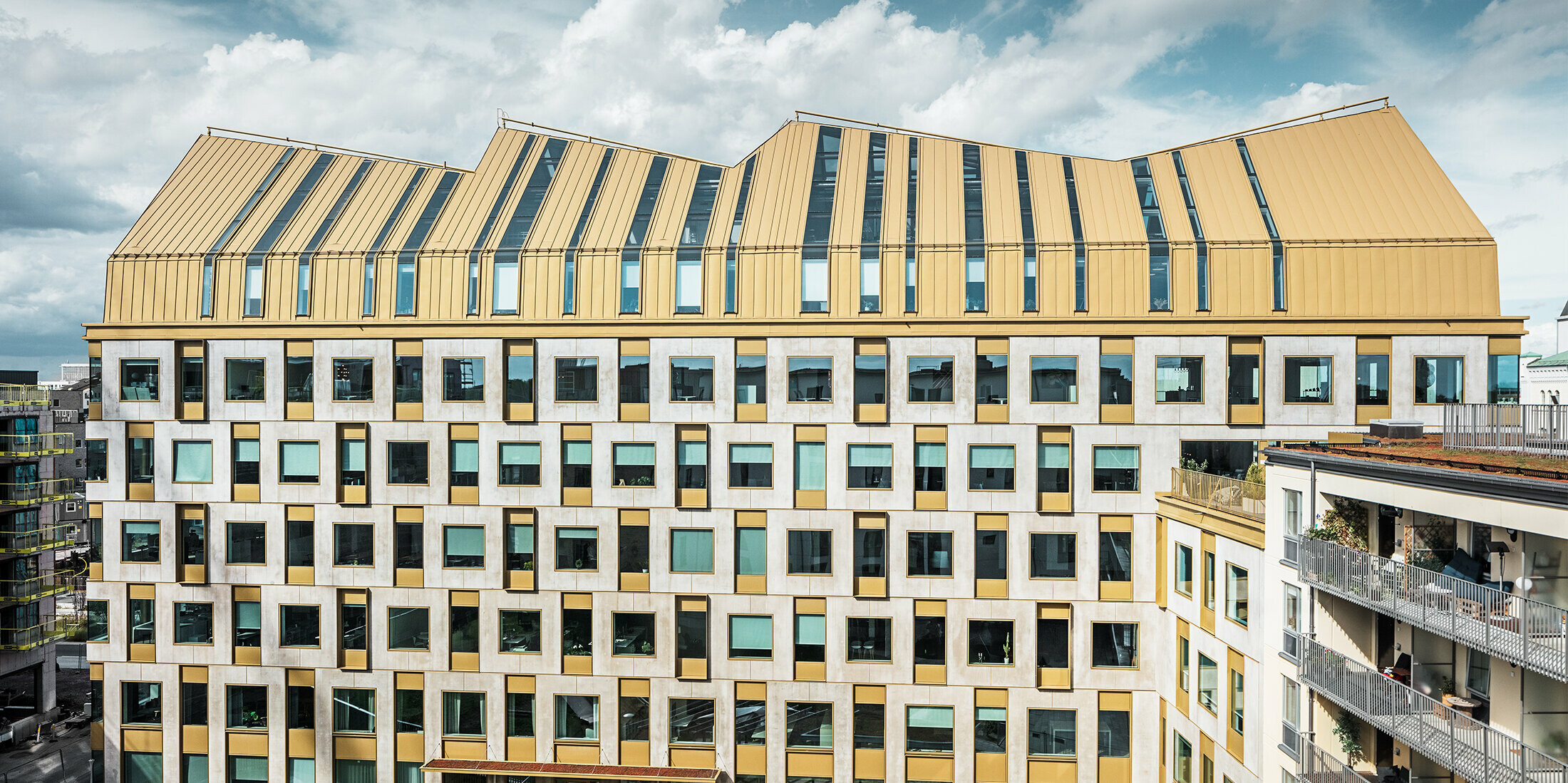 L’ossature porteuse en acier de la toiture est recouverte de 2 000 m² d’éléments PREFALZ dont le revêtement est une fabrication spéciale signée PREFA. La couleur spéciale élaborée pour ce projet s’appelle Or Jaisalmer, du nom de la ville indienne du désert dont la réputation de ville dorée a servi de modèle à la couleur chatoyante du revêtement.