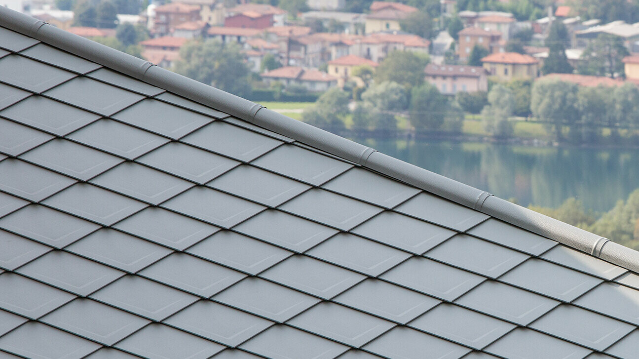 Le toit de la propriété a été rénové grâce aux losanges de toiture 29 × 29 dans la teinte vert mousse. Le système d'évacuation des eaux de PREFA sous la forme de la gouttière demi-ronde et du tuyau de decente est également de couleur vert mousse et s'adapte parfaitement à la nature autour de la maison.