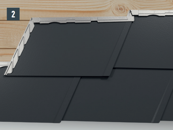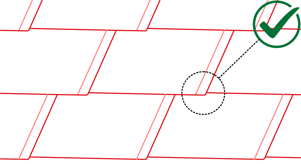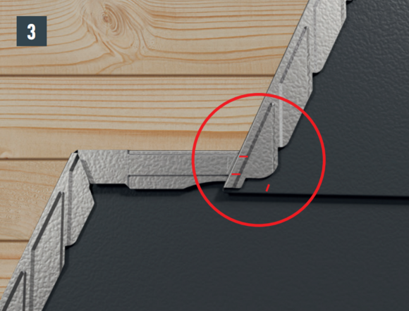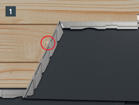 La forme du bardeau DS.19 crée un abaissement au niveau de son angle extérieur. Respectez également cet abaissement lors de la pose du premier bardeau DS.19 de chaque rangée, en ne poussant pas le premier complètement vers le haut dans la bande de départ ou l’agrafe. Positionnez l’angle extérieur du premier bardeau DS.19 de sorte que le rabat supérieur du bardeau soit rectiligne sur toute la longueur. Il faut éviter de recouvrir le premier bardeau DS.19.