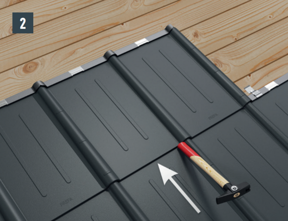 Poussez la tuile dans l’agrafe d’accrochage. Tapotez légèrement le bord inférieur de la tuile avec le manche du marteau (Fig. 2).