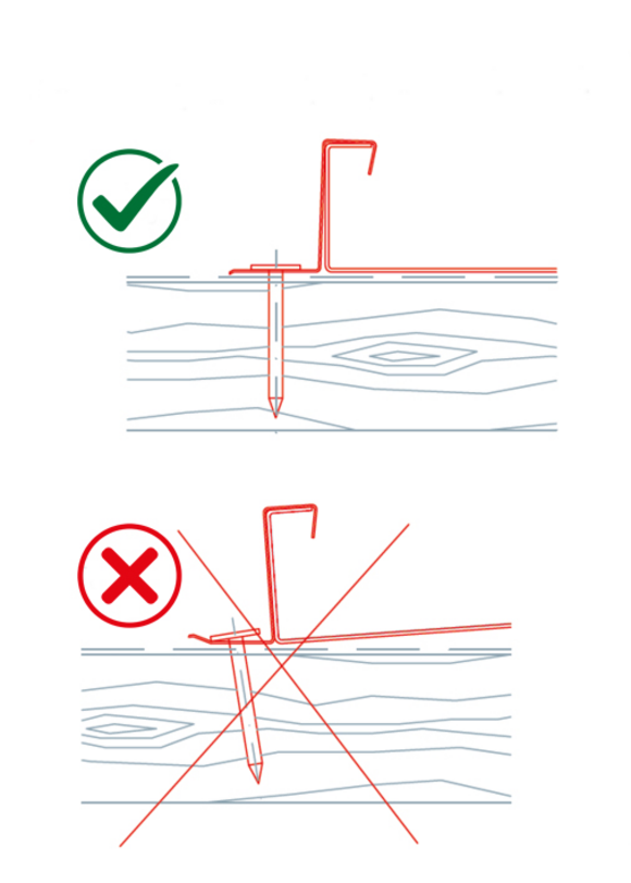 Lors de la fixation des pattes fixes et des pattes coulissantes PREFA Niro, il convient de veiller à enfoncer suffisamment les clous annelés de fixation et à ne pas les laisser dépasser au-dessus de la moulure, afin de ne pas créer de points de pression et de frottement dans la couverture posée. La fixation des pattes fixes PREFA requiert 2 clous annelés PREFA Niro. La fixation des pattes coulissantes PREFA requiert 3 clous annelés PREFA Niro.