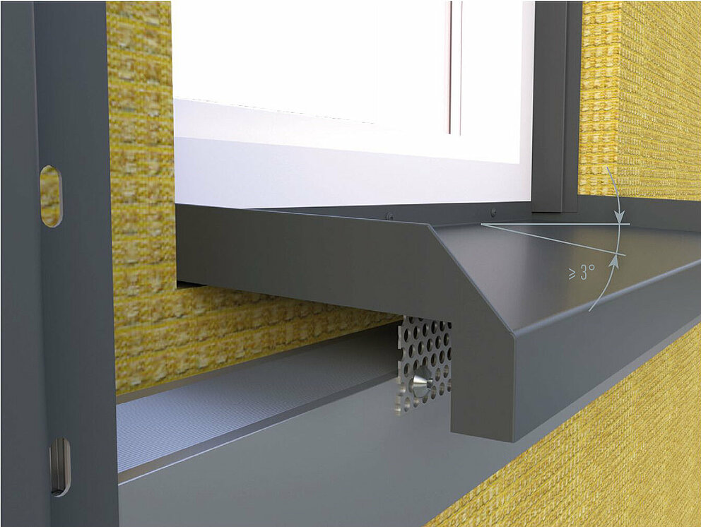 La tablette de fenêtre doit être posée avec une pente d’au moins 3 °. À cet égard, veuillez respecter les exigences en vigueur au niveau national.