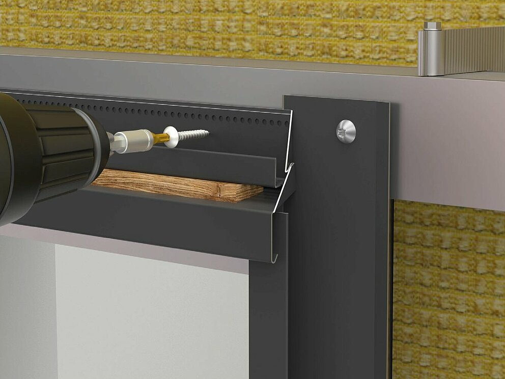 Ensuite, il faut visser à gauche et à droite de la fenêtre le profil d’accrochage pour l’habillage de tableau, sur la sous-construction. C’est à ce moment-là qu’il faut également fixer les profils de jonction pour l’habillage de tableau et le profil de jonction pour le linteau de fenêtre sur le cadre de la fenêtre ou sur la maçonnerie.