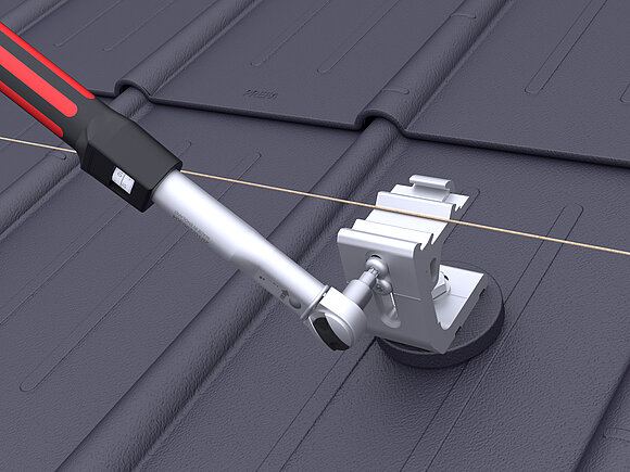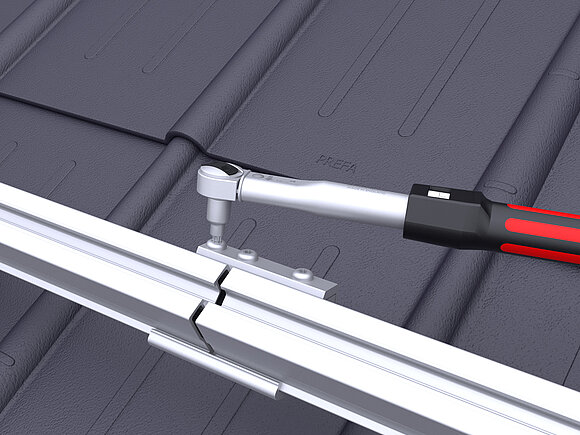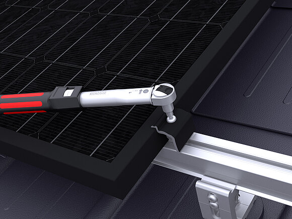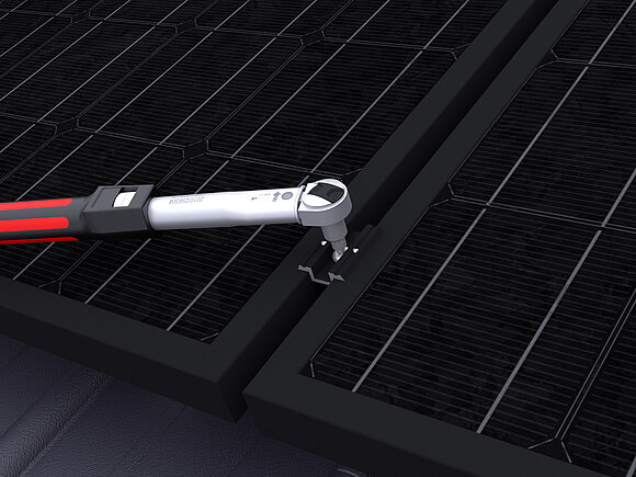 Ensuite, les modules sont placés et les bornes centrales et bornes de fin sont serrées avec un couple de 15 Nm.