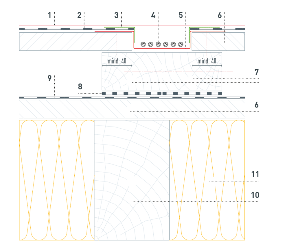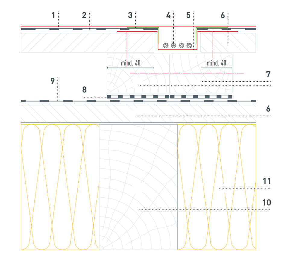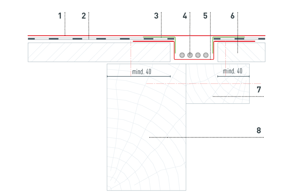 Afin de pouvoir faire passer les câbles nécessaires, la sous-construction en bois doit-être fabriquée selon les caractéristiques suivantes. Le nombre et la position des canaux de câbles sont définis par le service technologie produit de PREFA et représentés dans le plan de pose de l’installation photovoltaïque.