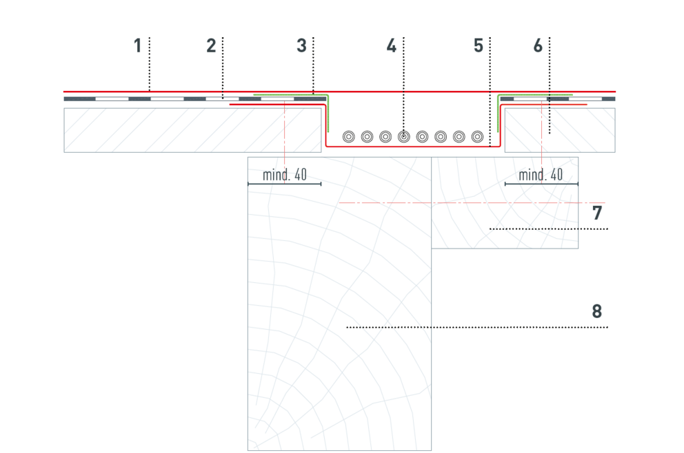 Avec une construction de toit simple peau non isolée, il faut prévoir une sous-couverture de toit répondant aux exigences des réglementations nationales (normes relatives aux sous-couvertures), avec au moins une couche de séparation bitumineuse. Compte tenu de la résistance à la corrosion de l’aluminium, les nattes structurées sont superflues. PREFA ne préconise pas l’emploi de nattes structurées, En cas d’utilisation de couches de séparation plus épaisses, il faut utiliser des vis plus longues, si nécessaire.