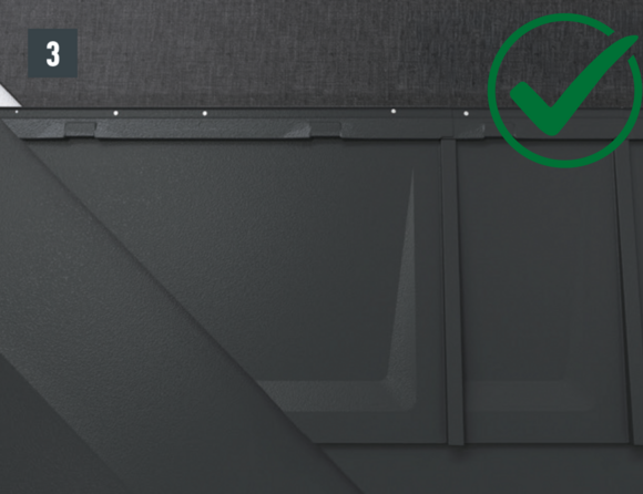 La bande de départ doit être clouée de manière à résister aux tempêtes (clouer tous les trous pré-percés). Préfixez la bande de départ sur toute la longueur avant de clouer tous les trous pré-percés avec les clous PREFA fournis.
