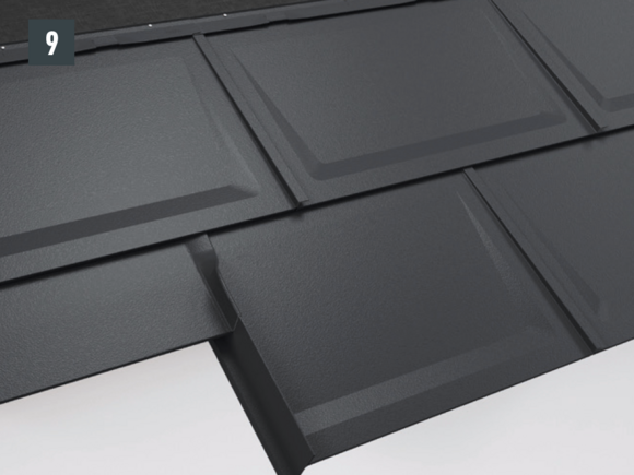 Posez le bardeau de raccord, découpez-le avec le supplément de l’agrafe de 30 mm et réalisez le pliage vers le haut (Fig. 8 et 9).