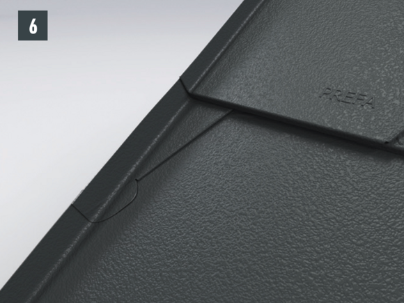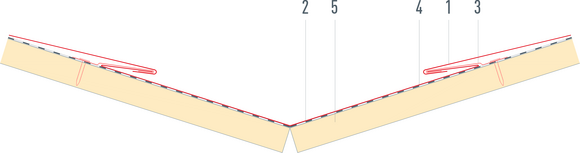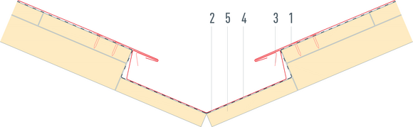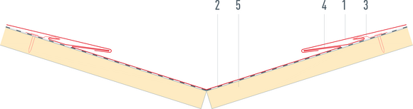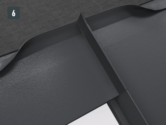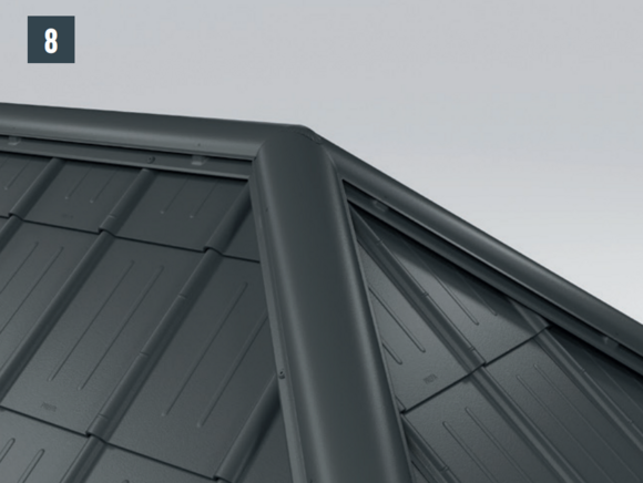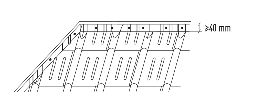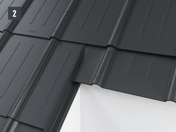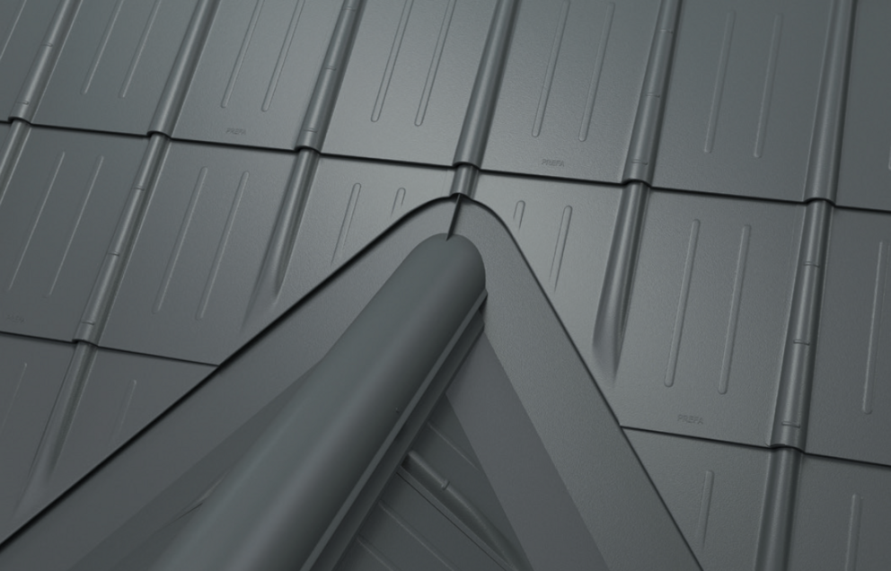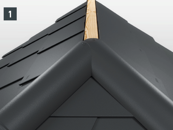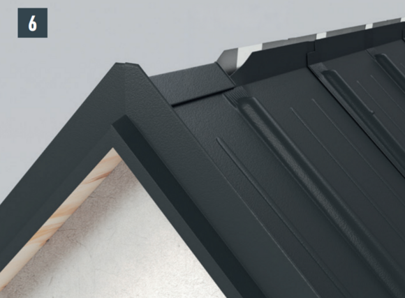 Afin de protéger le toit contre la neige poudreuse, il est indispensable de faire un relevé sur le produit de couverture PREFA d’au moins 40 mm dans les zones d’arêtier et de faîtage.