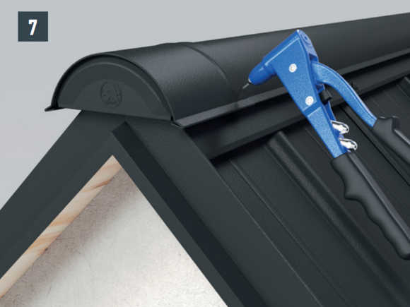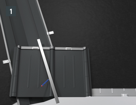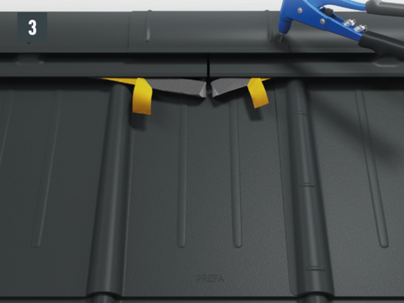 Fixez la dernière rangée (découpée si nécessaire) à l’aide d’une patte de maintien, en réalisant une fixation directe latérale sur le sommet de l’onde située en-dessous (pour les tuiles PREFA) ou bien sur la cale en mousse de la faîtière ventilée.