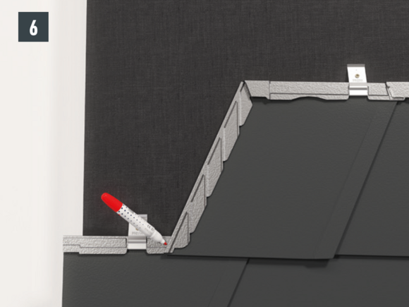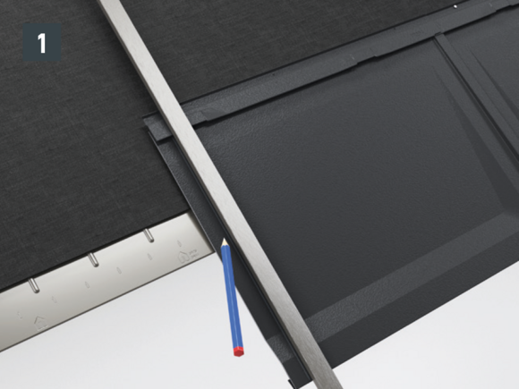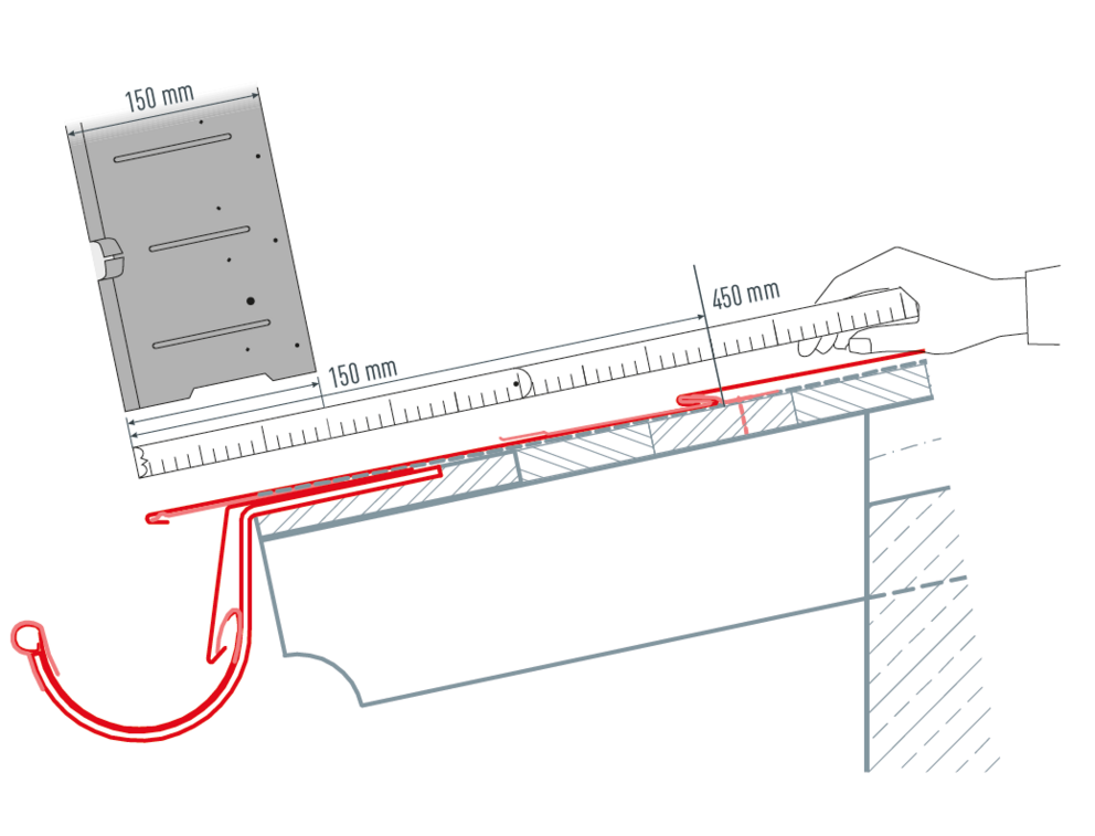 Mesurez 450 mm à partir du bord supérieur de la première tuile en direction de la gouttière (veillez à ce que le débord de gouttière soit compris entre 30 et 80 mm). Faites une marque à 150 mm (largeur de la bande de départ) du bas (= largeur de la bande de départ jusqu’au bord supérieur).