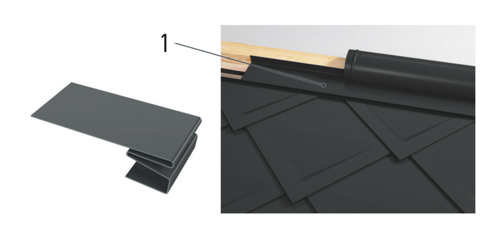 Entre les demi-losanges de fin pour losanges de toiture 29 × 29, il faut monter la bande de recouvrement (1) fournie.