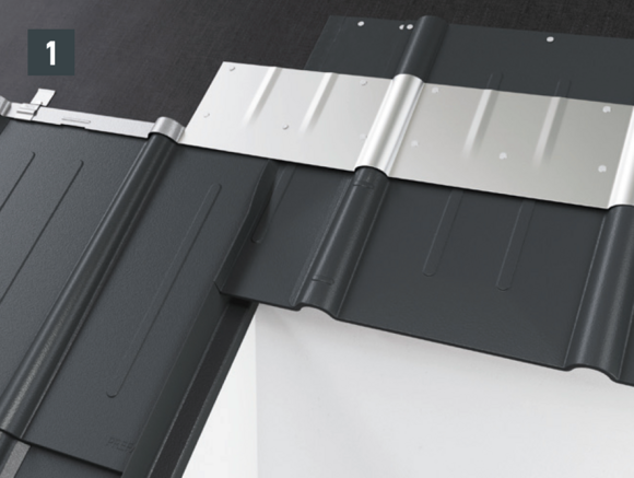 La faîtière ventilée est dotée d’une bavette d’appui des deux côtés. Il faut cependant faire un relevé sur le produit de couverture de 40 mm pour obtenir un raccord étanche à la pluie.