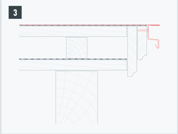 Au niveau de chaque relevé des bardeaux du côté gauche (bande de rive et abergement), il faut couper la pince latérale vers le bas afin d’éviter un effet de capillarité.