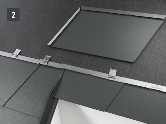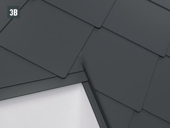 Une fois les losanges de toiture 44 x 44 préparés, il est possible de réaliser une pièce de raccordement (par ex. habillage de rive ou raccordements de couloir) et de l’intégrer dans la couverture.