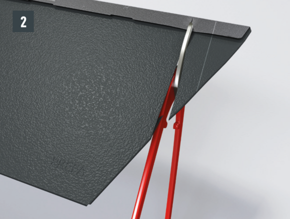 Au niveau où doit être réalisé le pliage vers le haut, découpez l’agrafe brevetée supérieure de manière à laisser une agrafe d’accrochage et pliez la tuile R.16 ou le panneau de toiture FX.12 à 30 mm vers le haut, à angle droit par rapport à la surface du toit (Fig. 1+2).