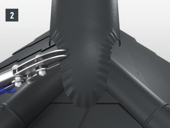 Lors du raccordement de la faîtière ventilée à la noue, il faut veiller à l’étanchéité de la faîtière ventilée et faire en sorte que les eaux de pluie ne puissent pas pénétrer à l’intérieur de la faîtière depuis la surface principale du toit.