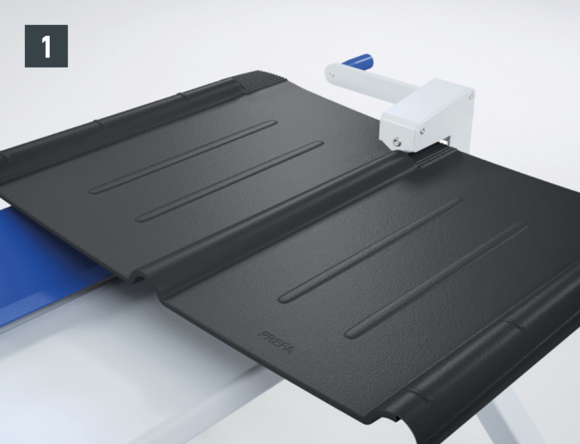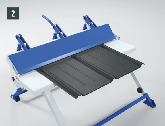 La machine à moulurer PREFA et le banc de pliage PREFA permettent de travailler facilement et rapidement les tuiles au niveau des faîtages, des arêtes et des pièces de raccordement Fig. 1 et 2)