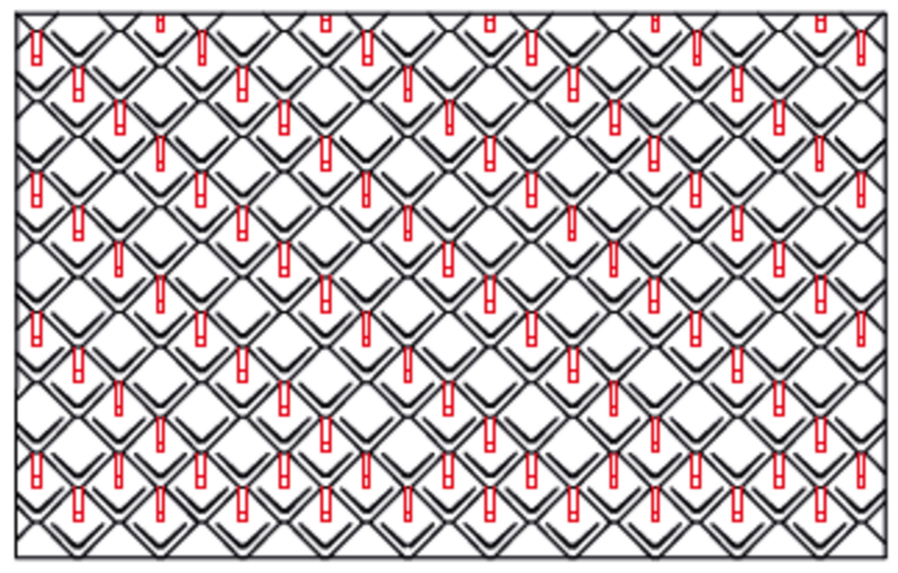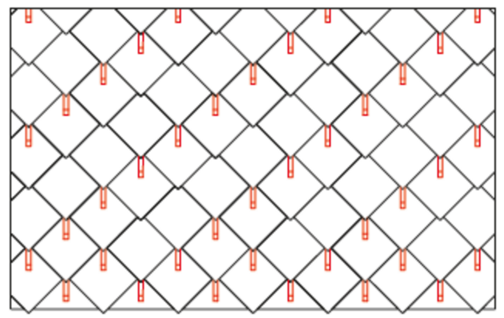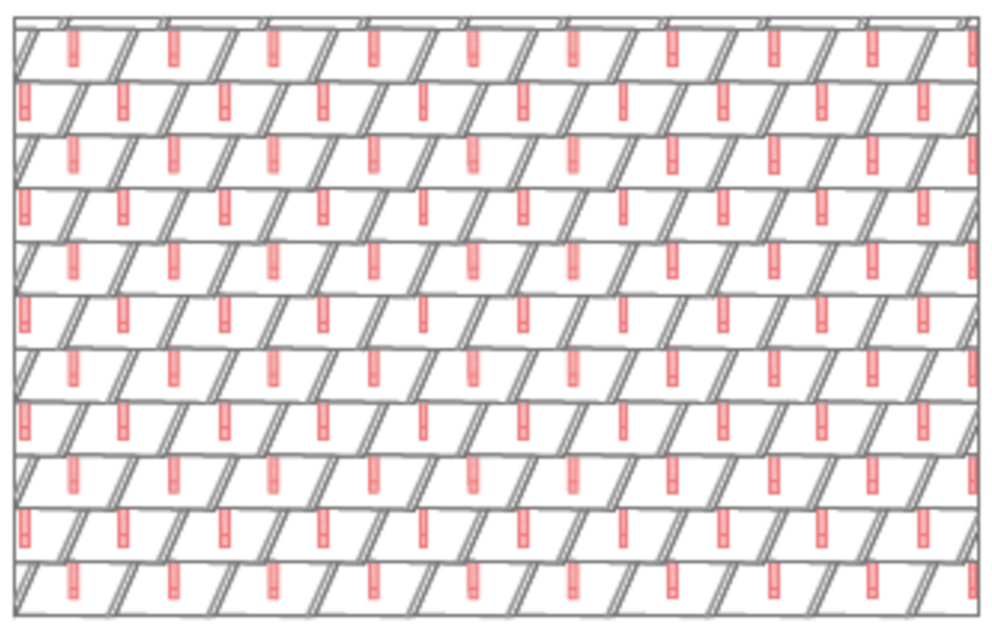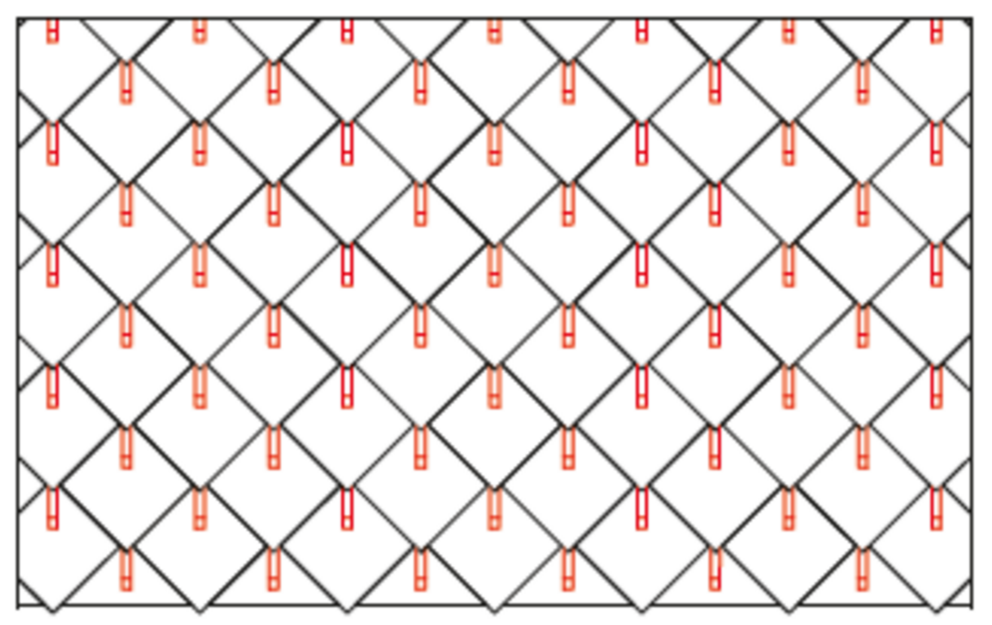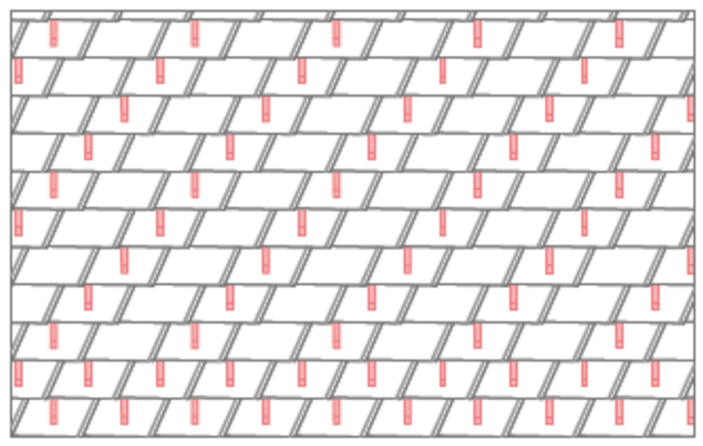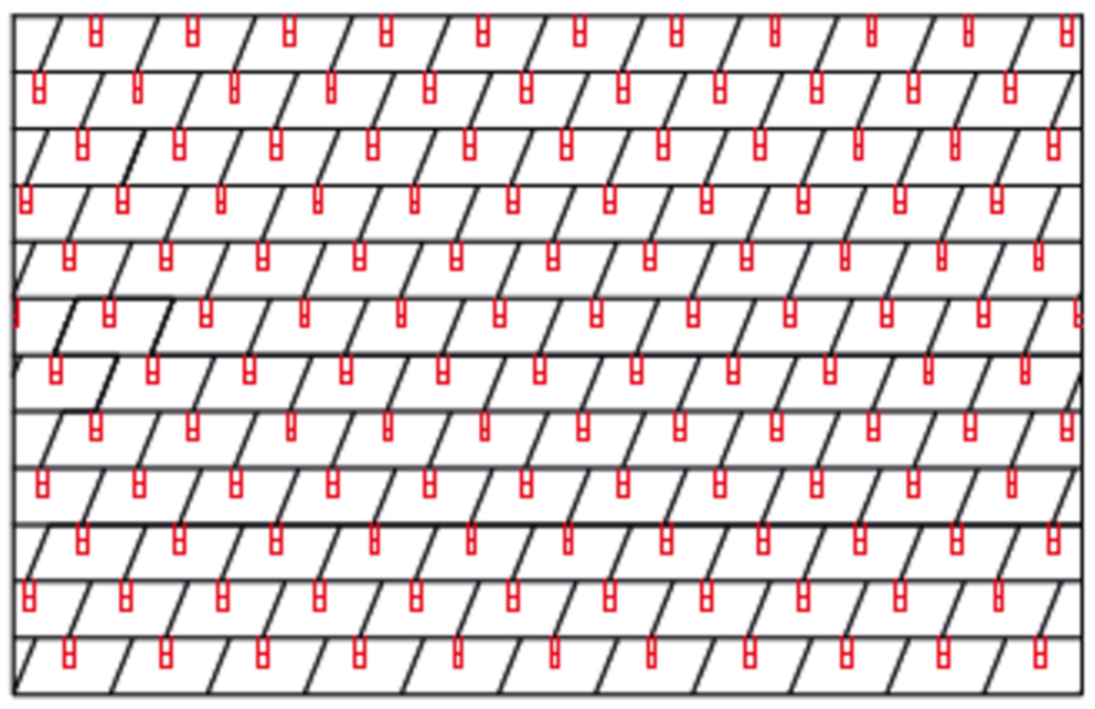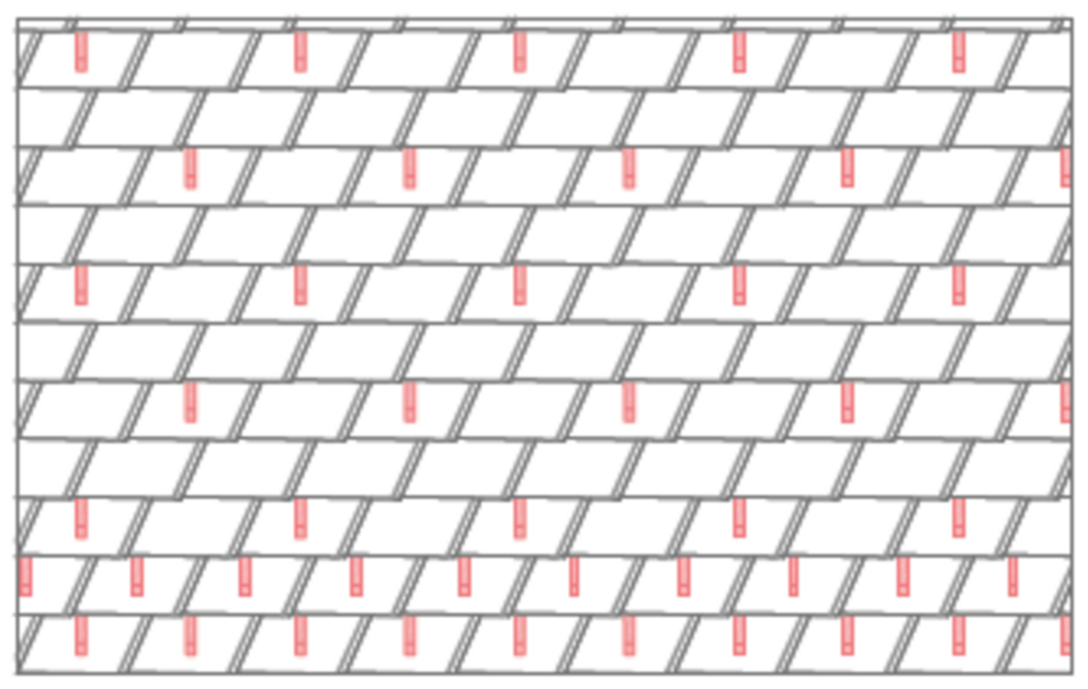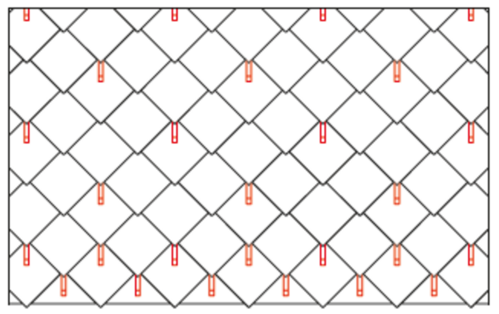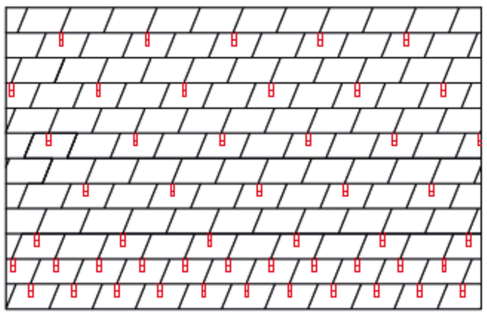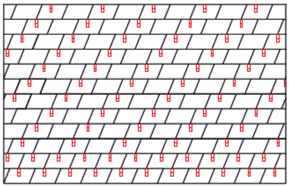Les arrêts de neige sont insérés au centre de l’ouverture des losanges de toiture 44 × 44 et fixés à l’aide d’au moins 2 clous annelés. L’utilisation d’arrêts de neige n’a aucune influence sur le nombre de fixations pour les losanges de toiture 44 × 44. Pour les panneaux de toiture 44 x 44, on utilisera 1,3, 2,6 ou 5,2 arrêts de neige par m² (voir tableau suivant – schémas de pose DR44 1, DR44 2 et DR44 3). Les deux premières rangées (demi-losanges de départ pour losanges de toiture 44 × 44 et première rangée de losanges de toiture 44 × 44) doivent être munies d’arrêts de neige sur toute la longueur.