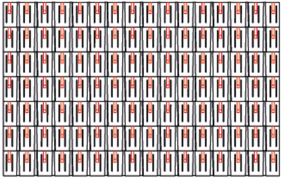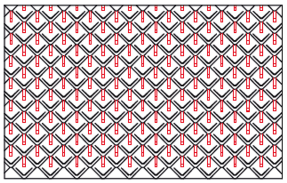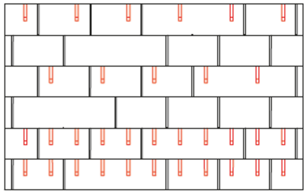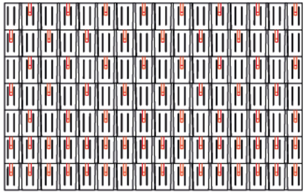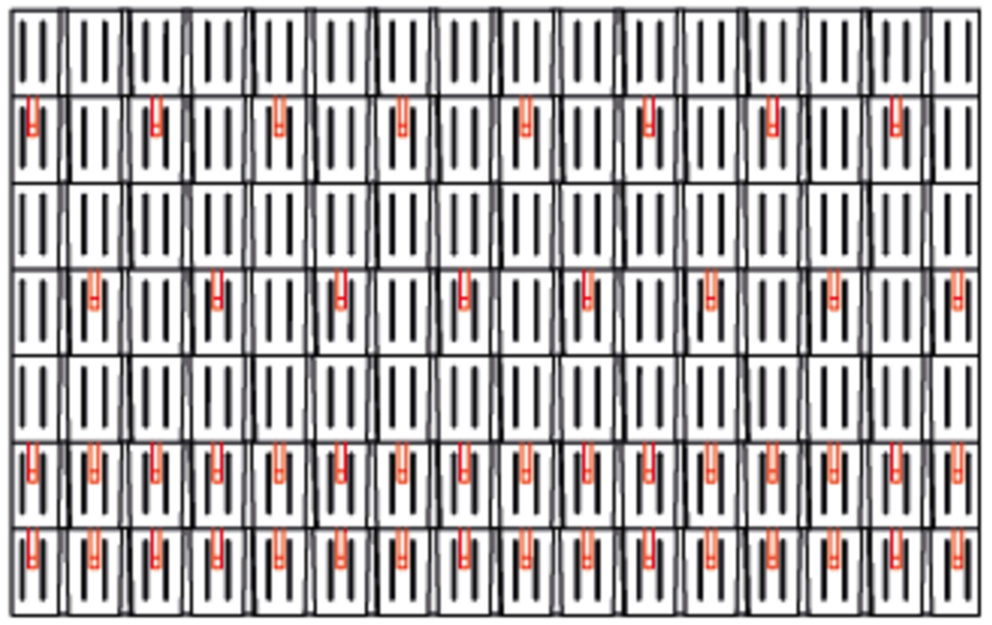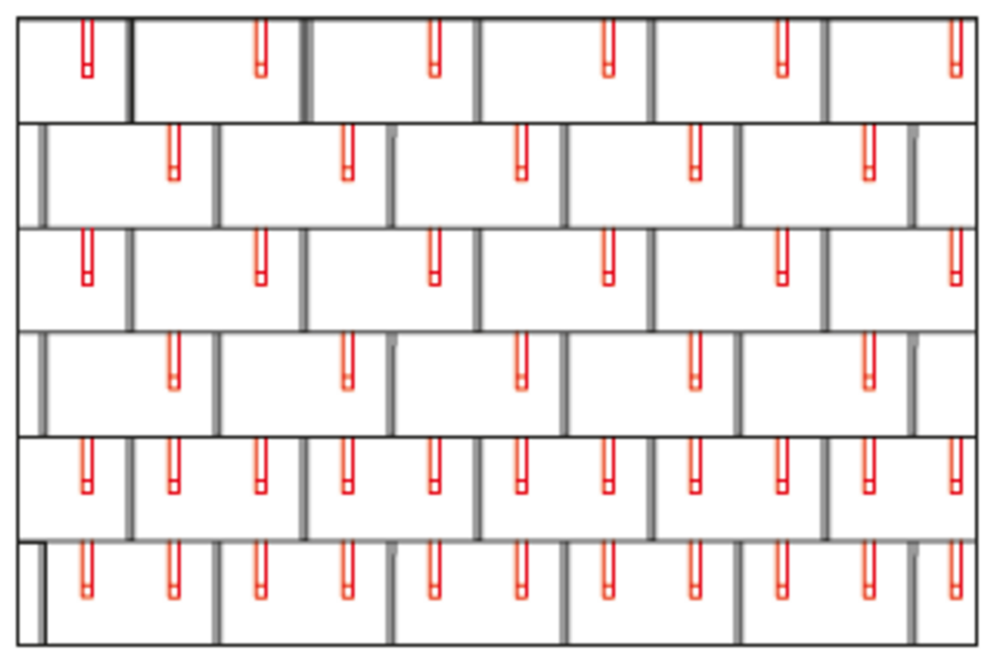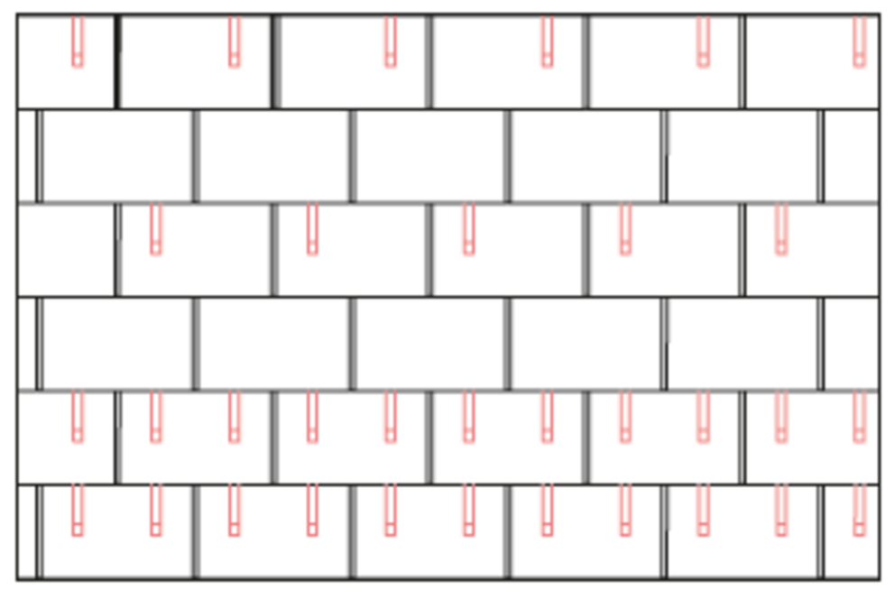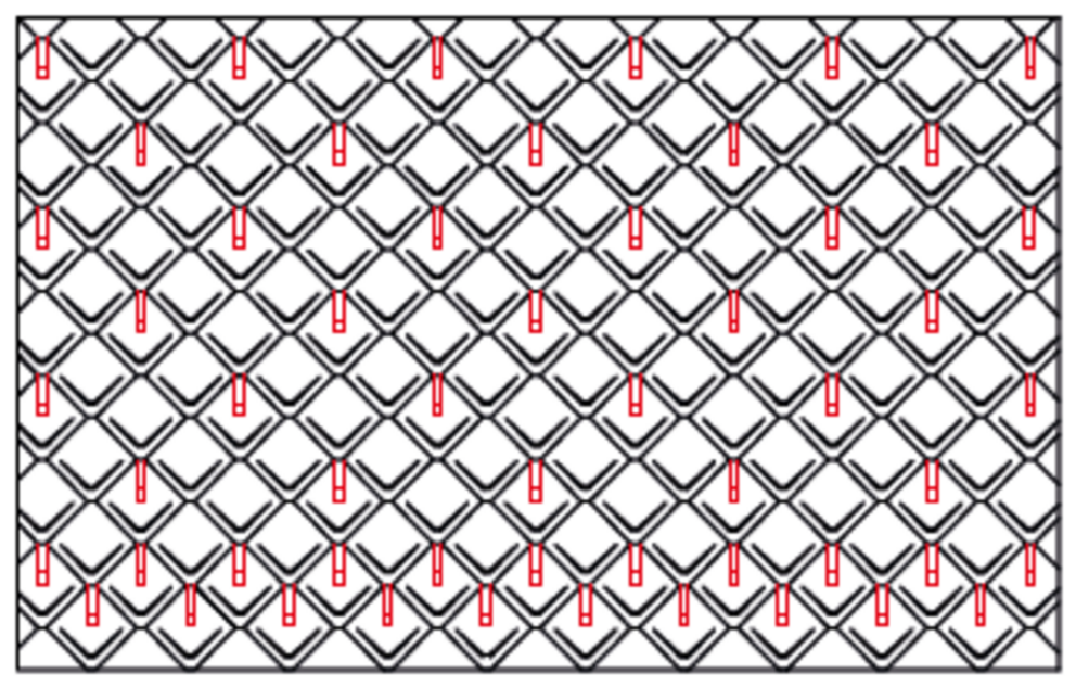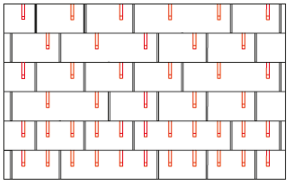Les arrêts de neige sont insérés au centre de l’ouverture des losanges de toiture 44 × 44 et fixés à l’aide d’au moins 2 clous annelés. L’utilisation d’arrêts de neige n’a aucune influence sur le nombre de fixations pour les losanges de toiture 44 × 44. Pour les panneaux de toiture 44 x 44, on utilisera 1,3, 2,6 ou 5,2 arrêts de neige par m² (voir tableau suivant – schémas de pose DR44 1, DR44 2 et DR44 3). Les deux premières rangées (demi-losanges de départ pour losanges de toiture 44 × 44 et première rangée de losanges de toiture 44 × 44) doivent être munies d’arrêts de neige sur toute la longueur.
