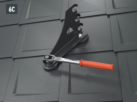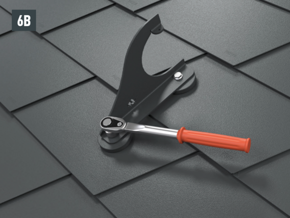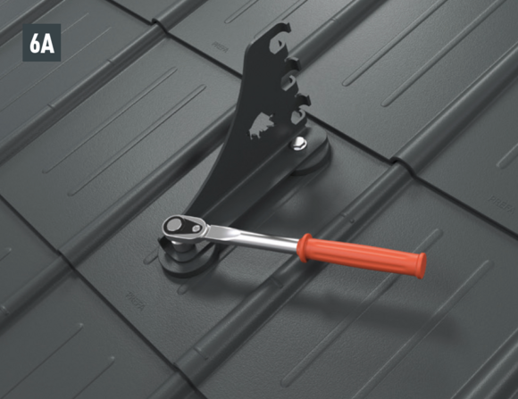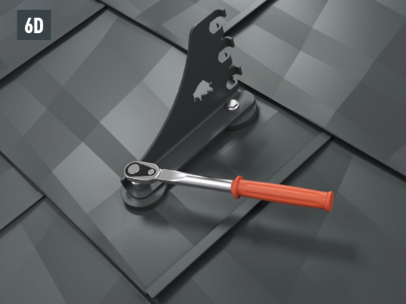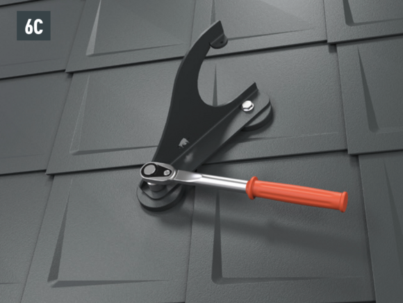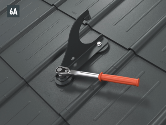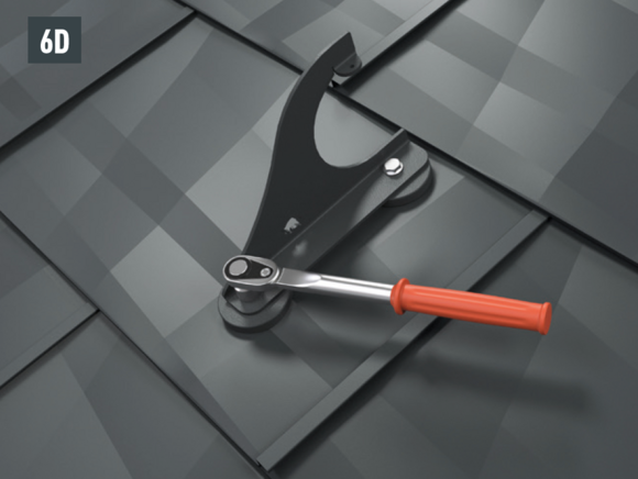Montage des crochets pour tubes pare-neige à l’aide des deux vis à tête hexagonale (M12) sur les platines (Clé dynamométrique de 19 ; couple de serrage : 35 Nm) pour les tuiles (Fig. 6A), les bardeaux (Fig. 6B), les losanges de toiture (Fig. 6C), les modèles R.16 et FX.12 (Fig. 6D).