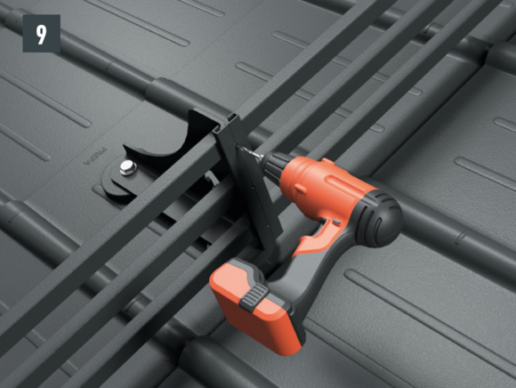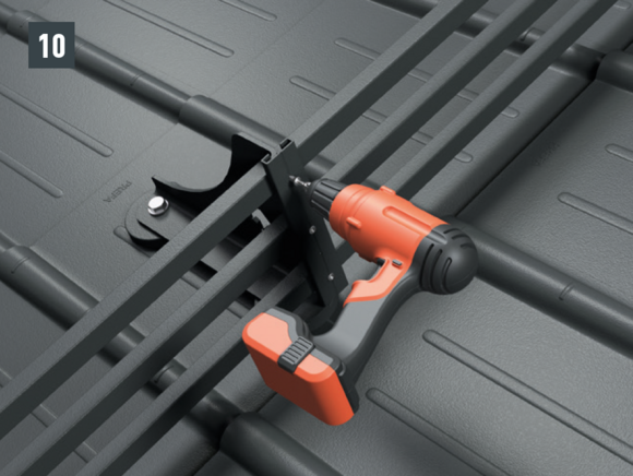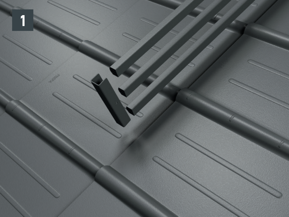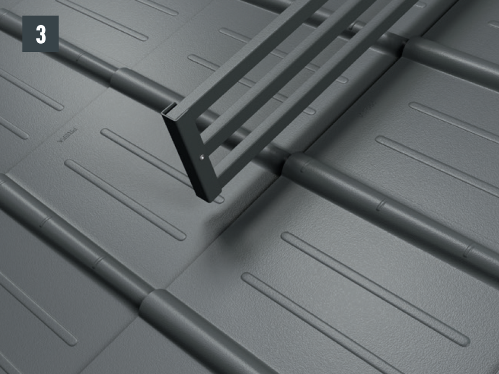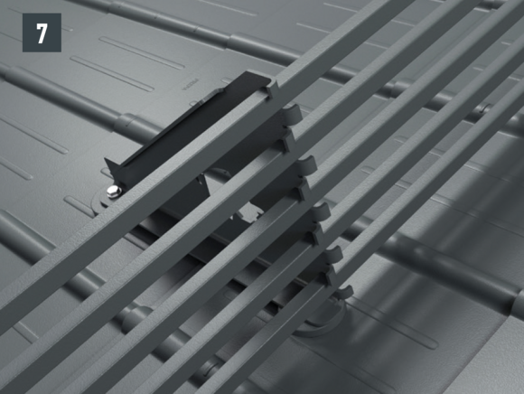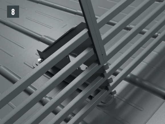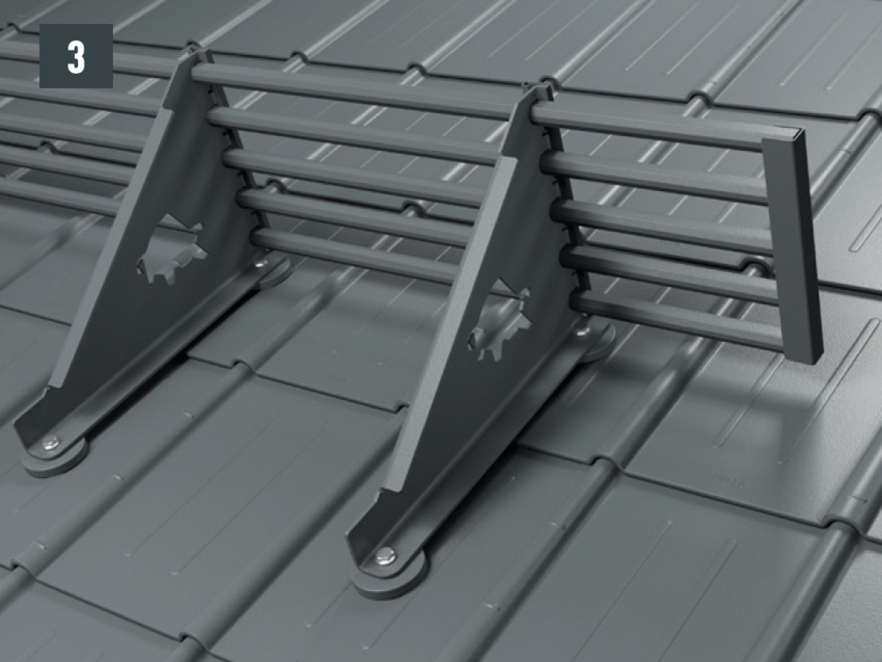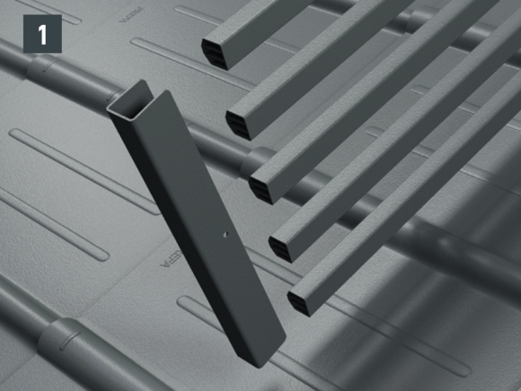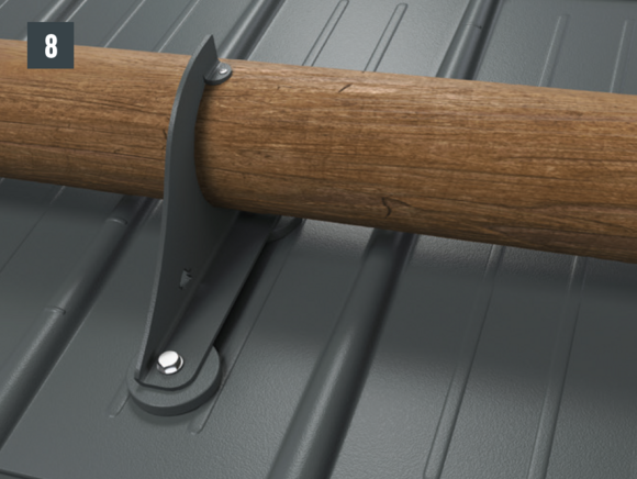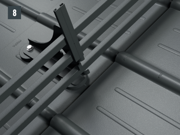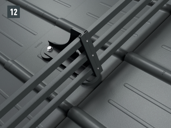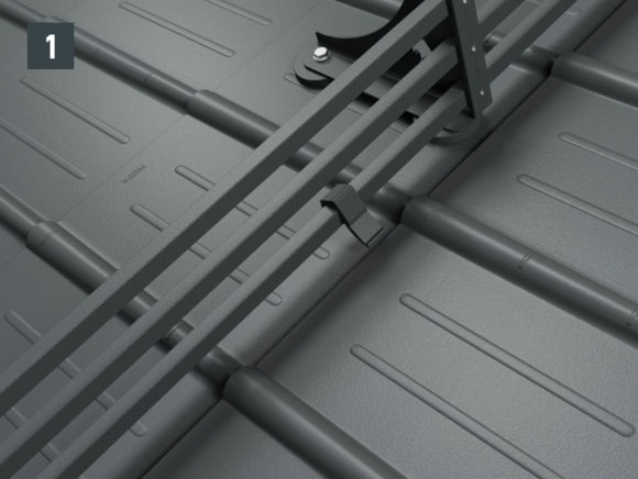 Les crochets pour tubes pare-neige sont montés sur la couverture de toit à l’aide de deux platines. Les barres pare-neige sont positionnées dans les crochets et fixées avec des profils de fermeture. Les barres pare-neige sont ensuite reliées entre elles au moyen de manchons de jonction – hauteur totale avec les platines : 219 mm.
