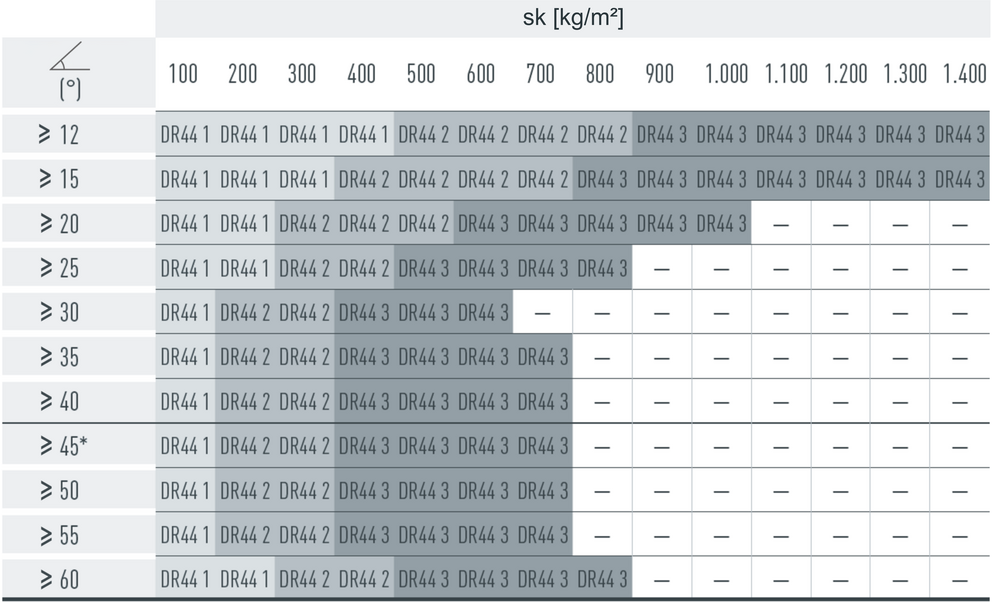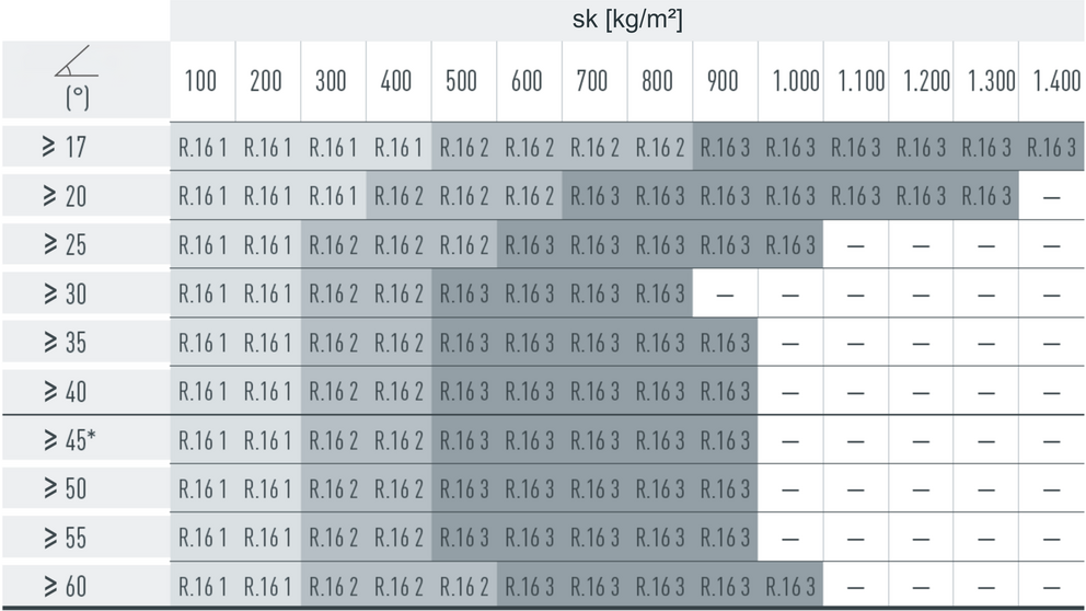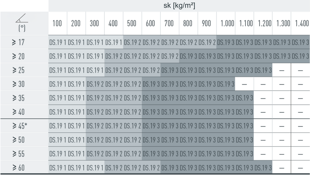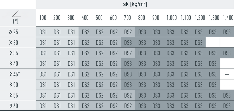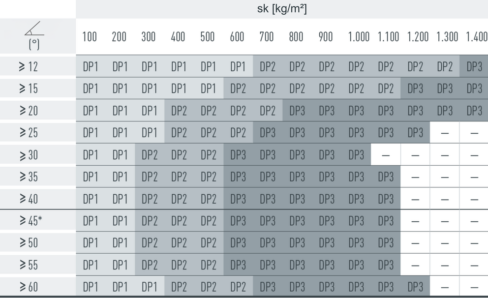 Le montage des arrêts de neige est réalisé selon les schémas de pose suivants, en fonction de la charge de neige et de la pente du toit. Les schémas de pose à appliquer sont présentés dans les tableaux ci-dessous. Dans le sens vertical, on trouve les informations concernant la pente de toit ; dans le sens horizontal, on trouve la charge de neige au sol (sk). Les charges de neige (sk) à prendre en compte pour chaque projet de construction doivent être déterminées conformément aux normes et réglementations nationales en vigueur.