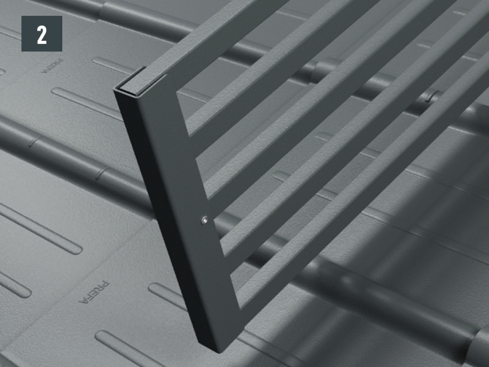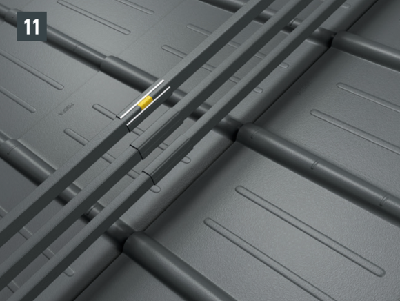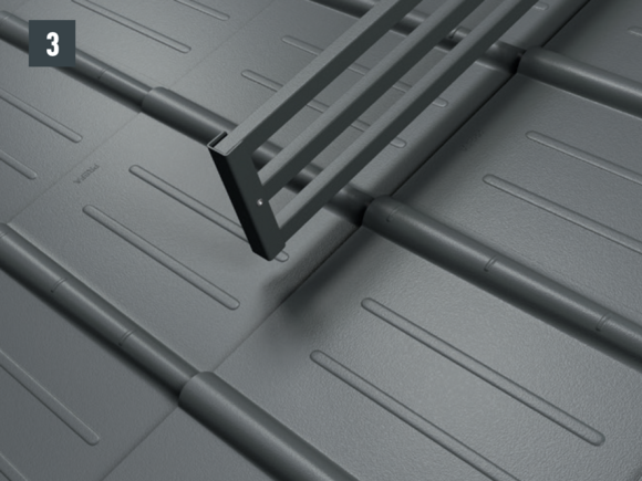 Les crochets pour tubes pare-neige XL sont montés sur la couverture de toit à l’aide de deux platines. Les barres pare-neige sont positionnées dans les crochets pour tubes pare-neige XL et fixées avec des profils de fermeture. Les barres pare-neige sont ensuite reliées entre elles au moyen de manchons de jonction – hauteur totale 360 mm :