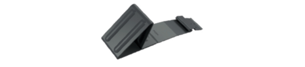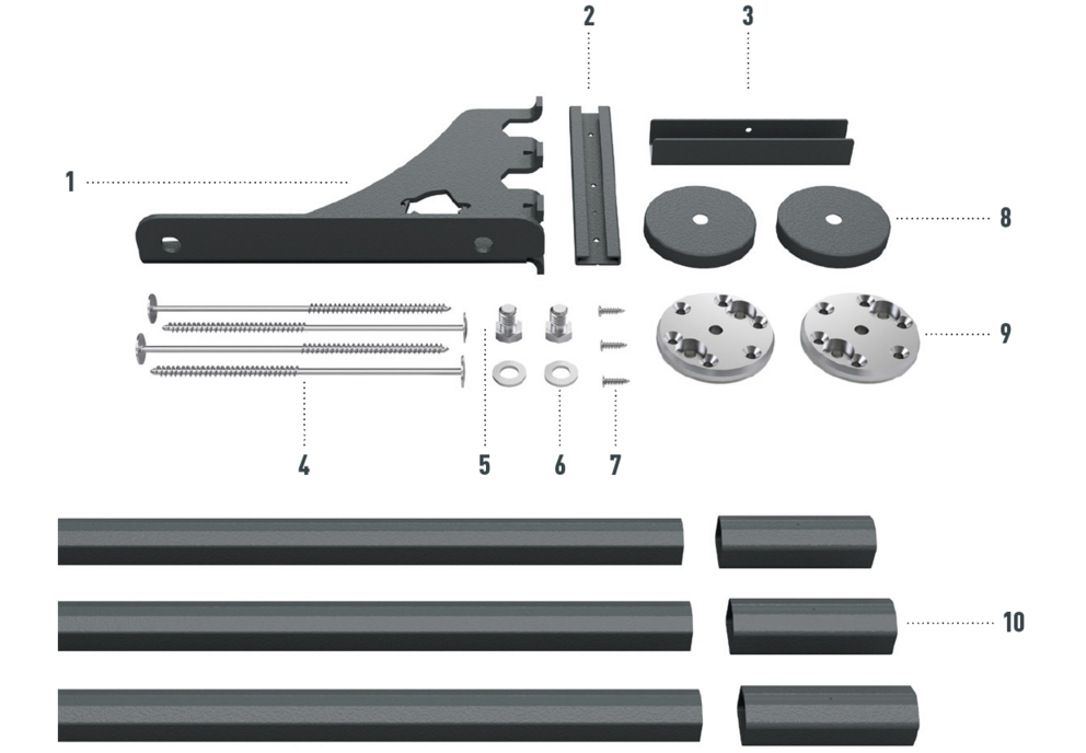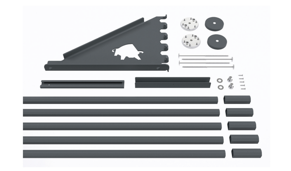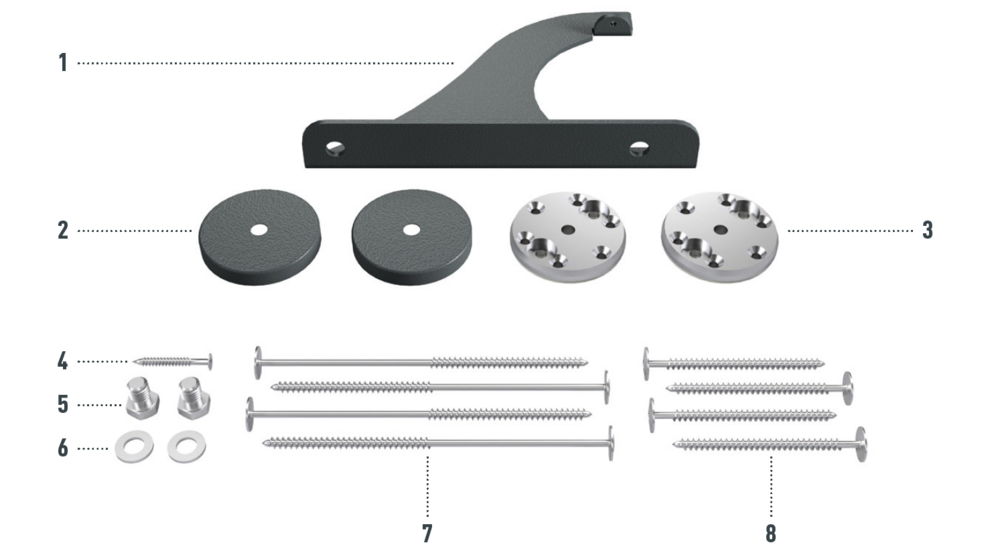 En alliage d’aluminium haute résistance avec revêtement coloré, composé de deux platines avec une garniture d’étanchéité, d’un crochet pour tubes pare-neige et d’une glissière de fixation, matériel de fixation inclus. |
