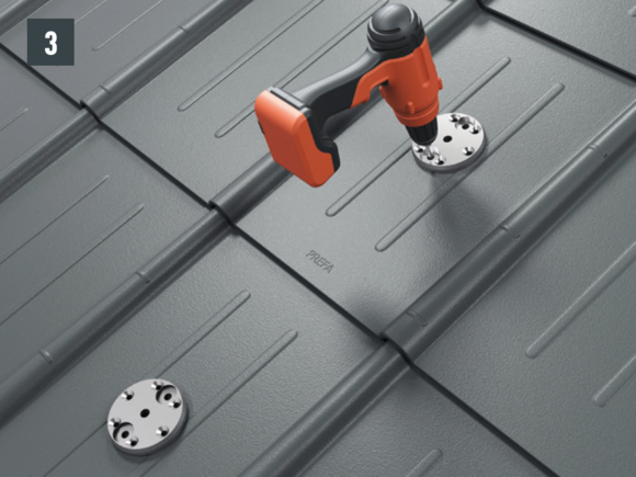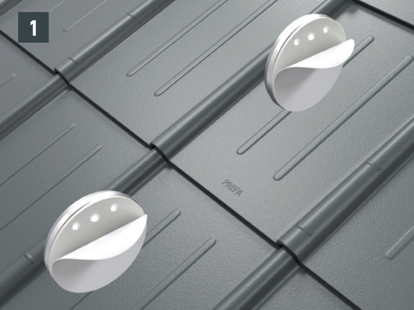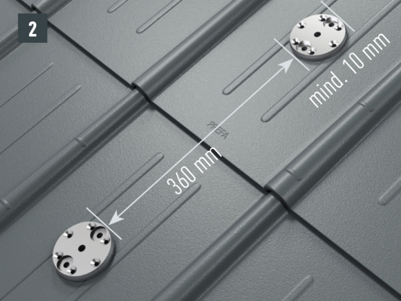 La platine ne doit pas être positionnée et fixée sur une agrafe ou sur une onde de la couverture PREFA. Respectez les zones de montage des produits utilisés. Il peut être nécessaire de monter une plaque de support (par ex. si une agrafe ou une onde se trouve au niveau d’un chevron).