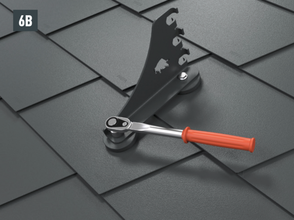 Les arrêts de neige sont insérés au centre de l’ouverture des losanges de toiture 29 × 29 et fixés à l’aide d’au moins 2 clous annelés. Lorsqu’un arrêt de neige est monté sur un losange de toiture 29 × 29, aucune fixation supplémentaire avec une patte n’est nécessaire sur ce losange.