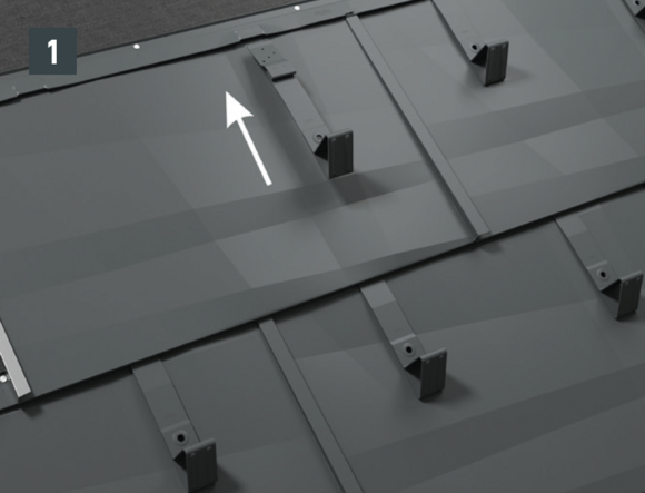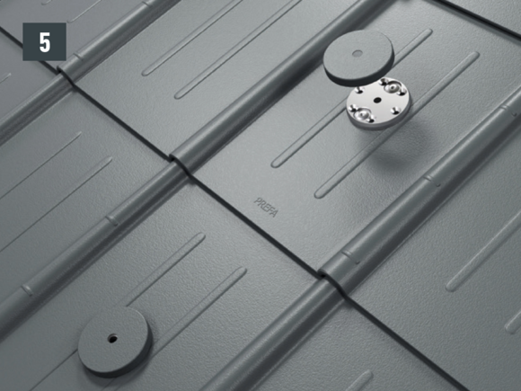 Quel que soit le système de toiture PREFA, il peut être nécessaire de monter une plaque de support (par ex. si une agrafe ou si une onde se trouve au niveau d’un chevron). Les platines ne doivent pas être positionnées et fixées sur une agrafe ou sur une onde de la couverture de toit PREFA.