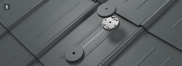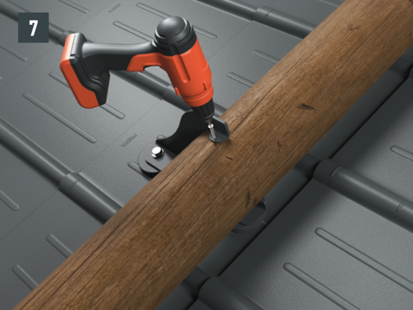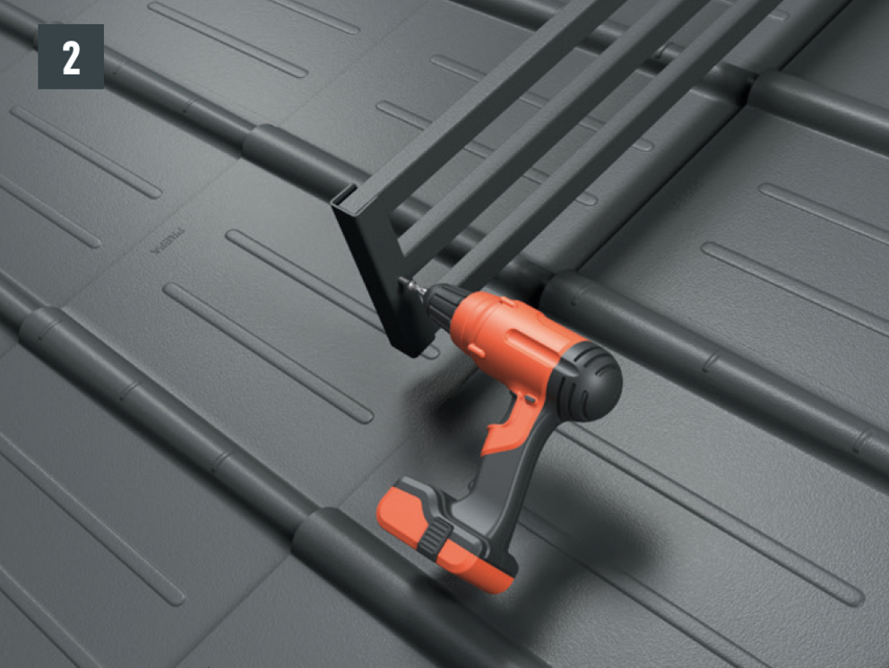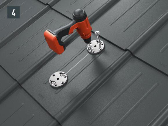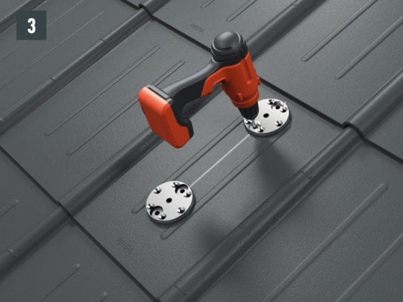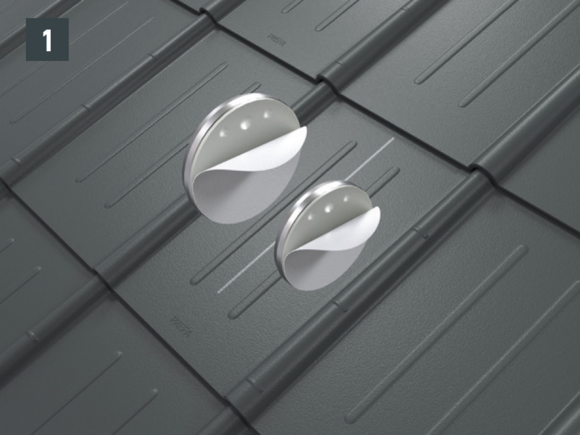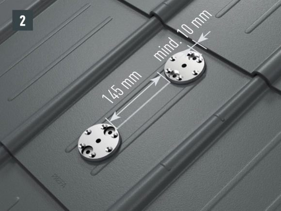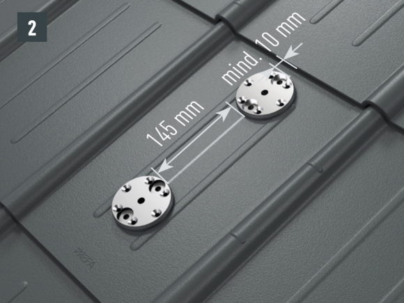 Pour la fixation sur le chevron, les trous (∅ 8,5 mm) doivent être dans l’axe du crochet pour tubes pare-neige (sur la longueur du chevron) – et donc les vis de fixation dans l’axe du chevron. Retirez le film de protection à l’arrière des platines, positionnez-les et collez-les (fig. 2).