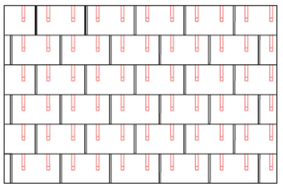 En principe, les panneaux de toiture FX.12 sont posés de façon irrégulière, avec un décalage du joint angulaire vertical d’au moins 220 mm. Compte tenu du décalage souhaité pour les panneaux de toiture FX.12, il n’est pas possible d’utiliser un schéma de pose symétrique. Si l’utilisation d’arrêts de neige est prévue pour des panneaux FX.12, il est recommandé de poser les panneaux de toiture FX.12 avec un décalage régulier. Le visuel irrégulier habituel des panneaux de toiture FX.12 ne sera plus présent mais c’est le seul moyen d’utiliser un schéma de pose régulier avec des arrêts de neige (Fig. 1 et 2).