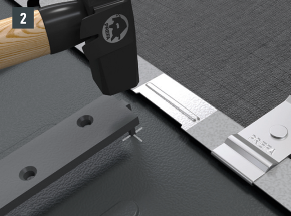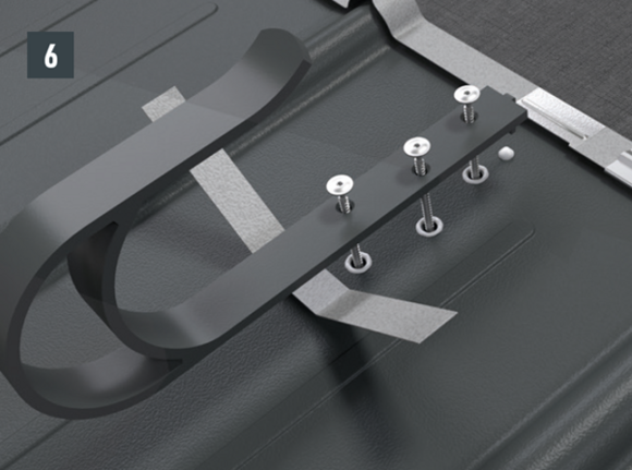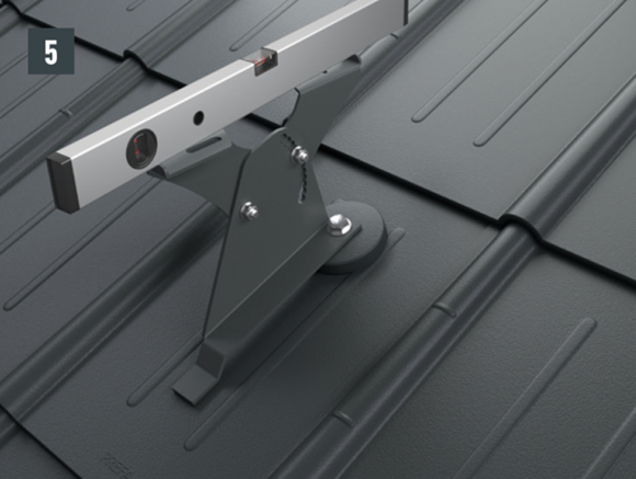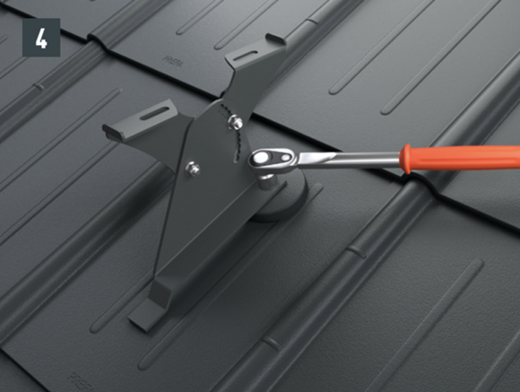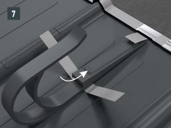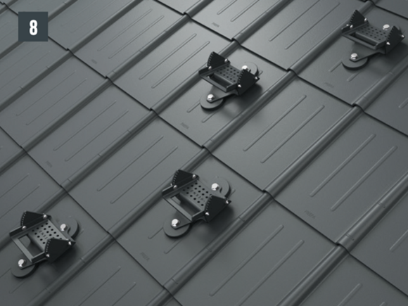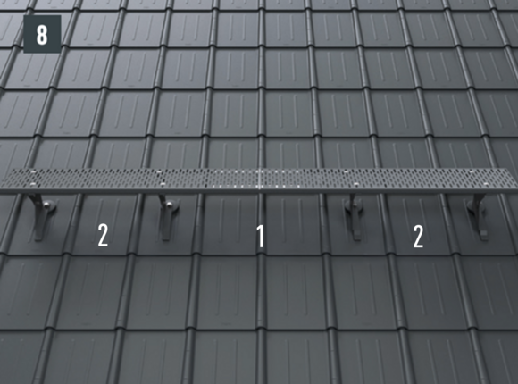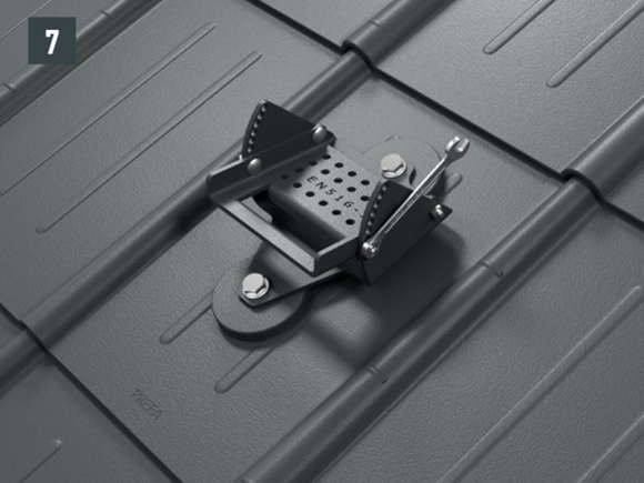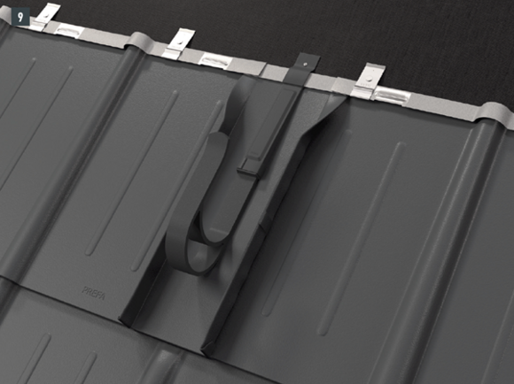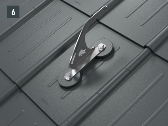Il faut respecter le guide de pose PREFA, les normes en vigueur et les bonnes pratiques professionnelles. Les crochets de sécurité doivent être montés au centre du chevron, avec les vis fournies.