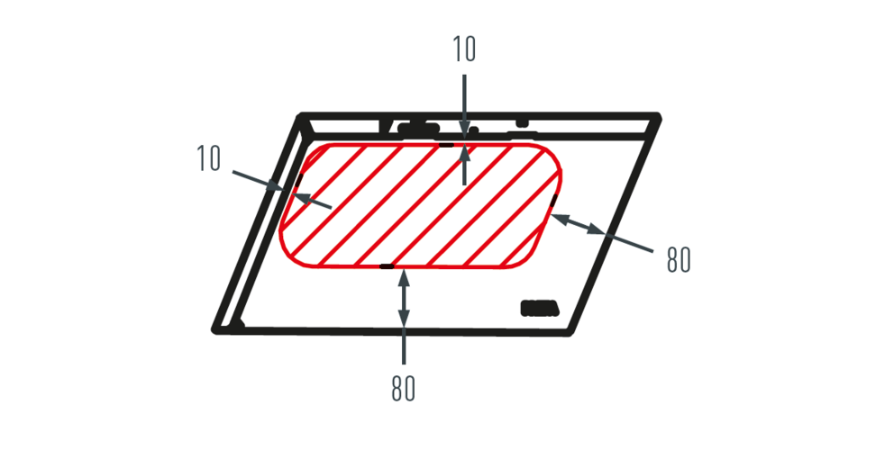 Lors du montage des accessoires de toiture, tenez compte de la zone de montage autorisée sur les bardeaux. La figure ci-dessous montre la zone de montage pour les accessoires sur platines. Pour les autres accessoires, des zones de montage différentes peuvent être définies.