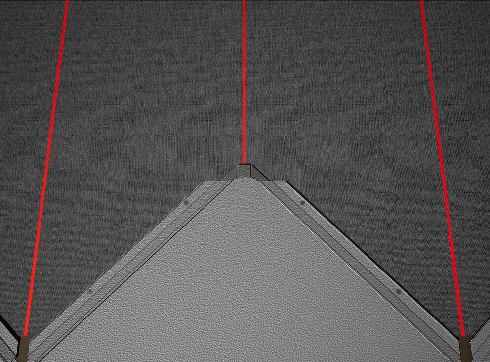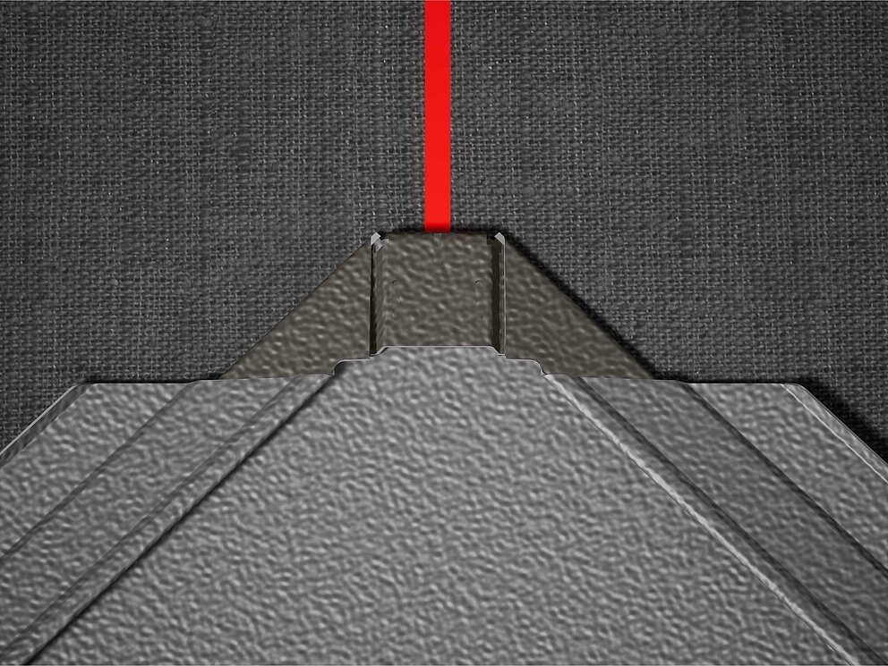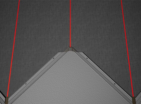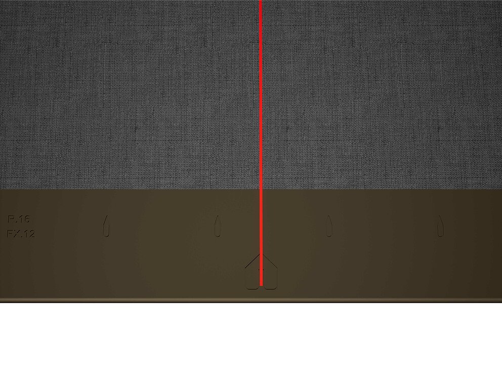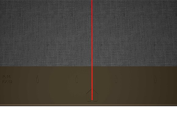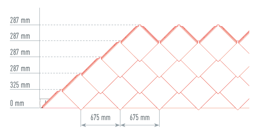 Pour faciliter la pose des losanges de toiture PREFA 44 × 44 , il est recommandé de réaliser une trame de marques de cordeau verticales espacées de 675 mm (s'aider des repères dans la bande de départ). Pour respecter précisément la cote de traçage dans chaque rangée, on peut si nécessaire marquer aussi la moitié de la cote de traçage et la vérifier à intervalles réguliers. Alignez les demi-losanges de départ en fonction des encoches (sur le bord supérieur des demi-losanges de départ) avec les marques de cordeau verticales (voir figure ci-dessous). Lors de cette opération, veillez à ce que la zone pour le rebord latéral (par ex. pour la réalisation de la rive) ne corresponde pas au centre des losanges de toiture 44 × 44 (respecter la symétrie / milieu du toit).