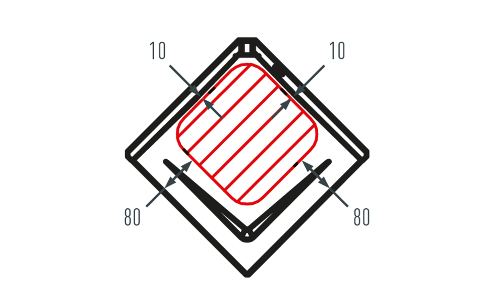 Lors du montage des accessoires de toiture, tenez compte de la zone de montage autorisée sur les losanges de toiture 29 × 29. La figure ci-dessous montre la zone de montage pour les accessoires sur platines. Pour les autres accessoires, des zones de montage différentes peuvent être définies.