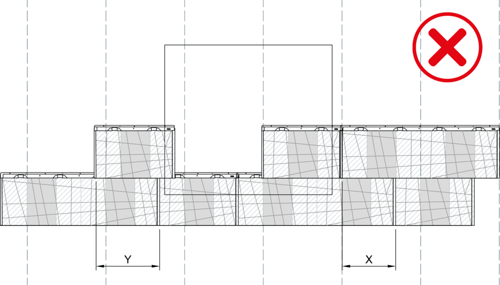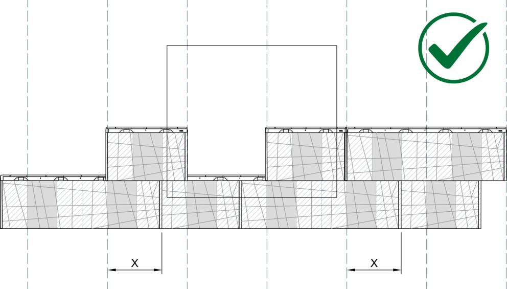 Lors de la pose des panneaux de toiture FX.12, aucun joint ne doit se trouver juste au-dessus d’un autre ; un décalage latéral d’au moins 220 mm doit être respecté. En cas d’association de grands et de petits panneaux FX.12, il faut à chaque nouvelle rangée placer le joint du premier panneau dans la zone « X » (voir la figure ci-dessous).