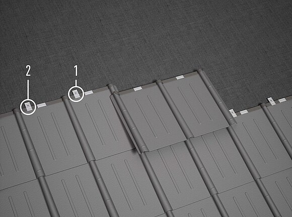 Fixez chaque tuile avec deux pattes brevetées (fixation standard). La fixation des pattes de fixation brevetées s’effectue à l’aide d’un clou annelé 2,8/30 ou 2,8/25 pour chacune d’elles. En cas d’utilisation de couches de séparation plus épaisses, il faut utiliser des clous plus longs, si nécessaire.