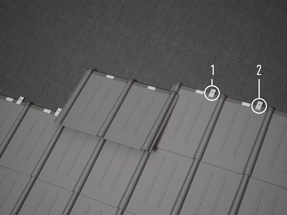 Les pattes doivent être placées à environ 3 cm de l’onde de la tuile. Dans les régions particulièrement exposées aux tempêtes, il est nécessaire de calculer la charge au vent et de renforcer la fixation en fonction du calcul ou d’utiliser une fixation vissée plutôt que clouée. Si les calculs indiquent que la fixation avec un nombre plus important de pattes n’est pas suffisante, il est possible de réaliser une fixation supplémentaire directement sur le côté en bordure de l’onde (onde inférieure) avec 2 Des vis à tête demi-ronde (4 × 25 mm) sont utilisées pour la fixation de chaque tuile. La disposition des pattes dépend du sens de couverture. Les pattes brevetées pour les tuiles et les bardeaux sont dotés d’une amorce supplémentaire. Cette amorce facilite le clouage lorsqu’il n’est pas possible d’utiliser le trou prévu à cet effet (par ex. à cause d’un nœud, d’une fente dans le voligeage).